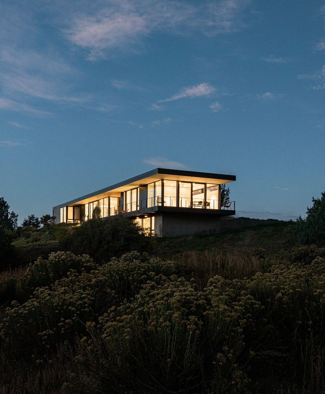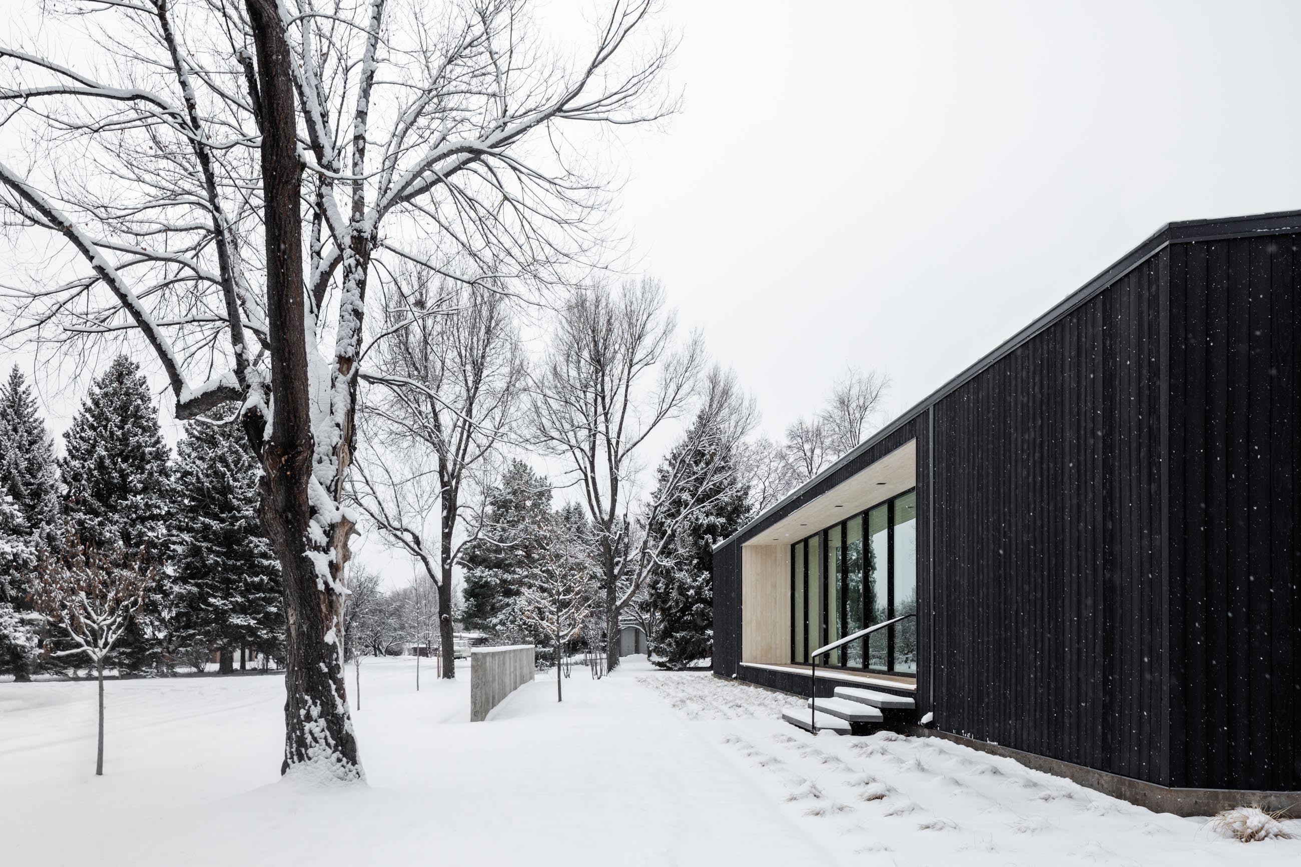 The foundation of the house takes inspiration from the numerous grey granite outcroppings scattered across the site, with a concrete plinth anchoring the structure This innovative concept gives the impression of a sleek black structure seemingly floating above the terrain, paying homage to the natural rock formations To maintain a sense of proportion and avoid an overly imposing presence, the lower level of the house is nestled into the hillside Strategically positioned, the pool defines the southern yard, creating a level outdoor space that blends seamlessly with the overall design
