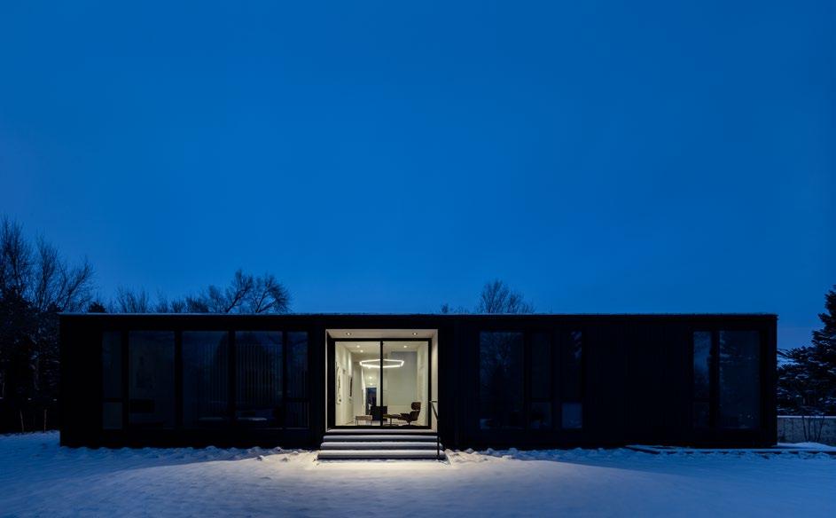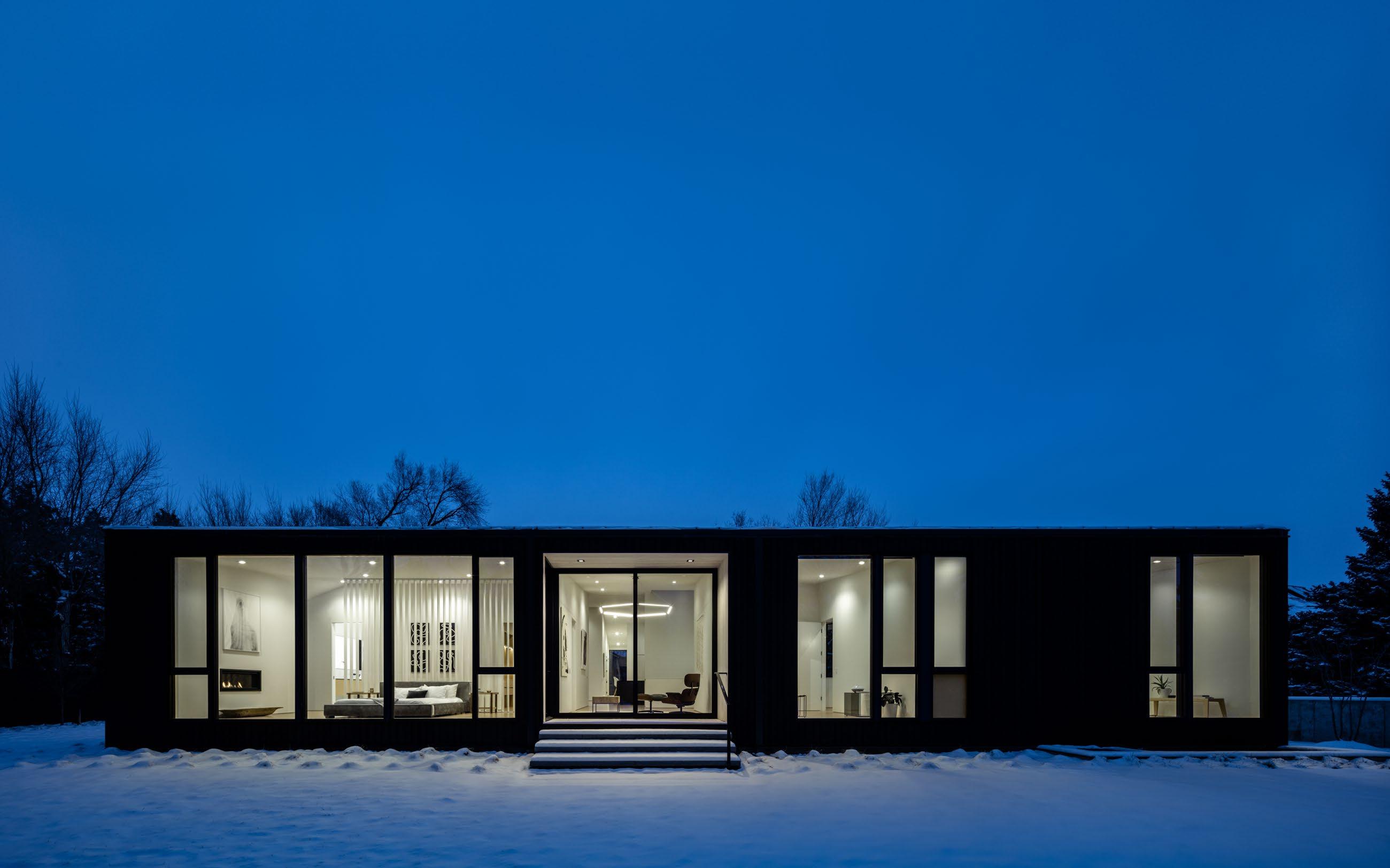 The house is a black, trapezoidal volume topped with a unique 5-ridge metal roof. It is penetrated to expose the light-filled interior and develop visual and physical connections to the adjacent gardens; each aperture providing its own quality of daylight as the day progresses. At night, the blackened wood siding disappears into the darkness, leaving only a uniform glow where these portals occur.