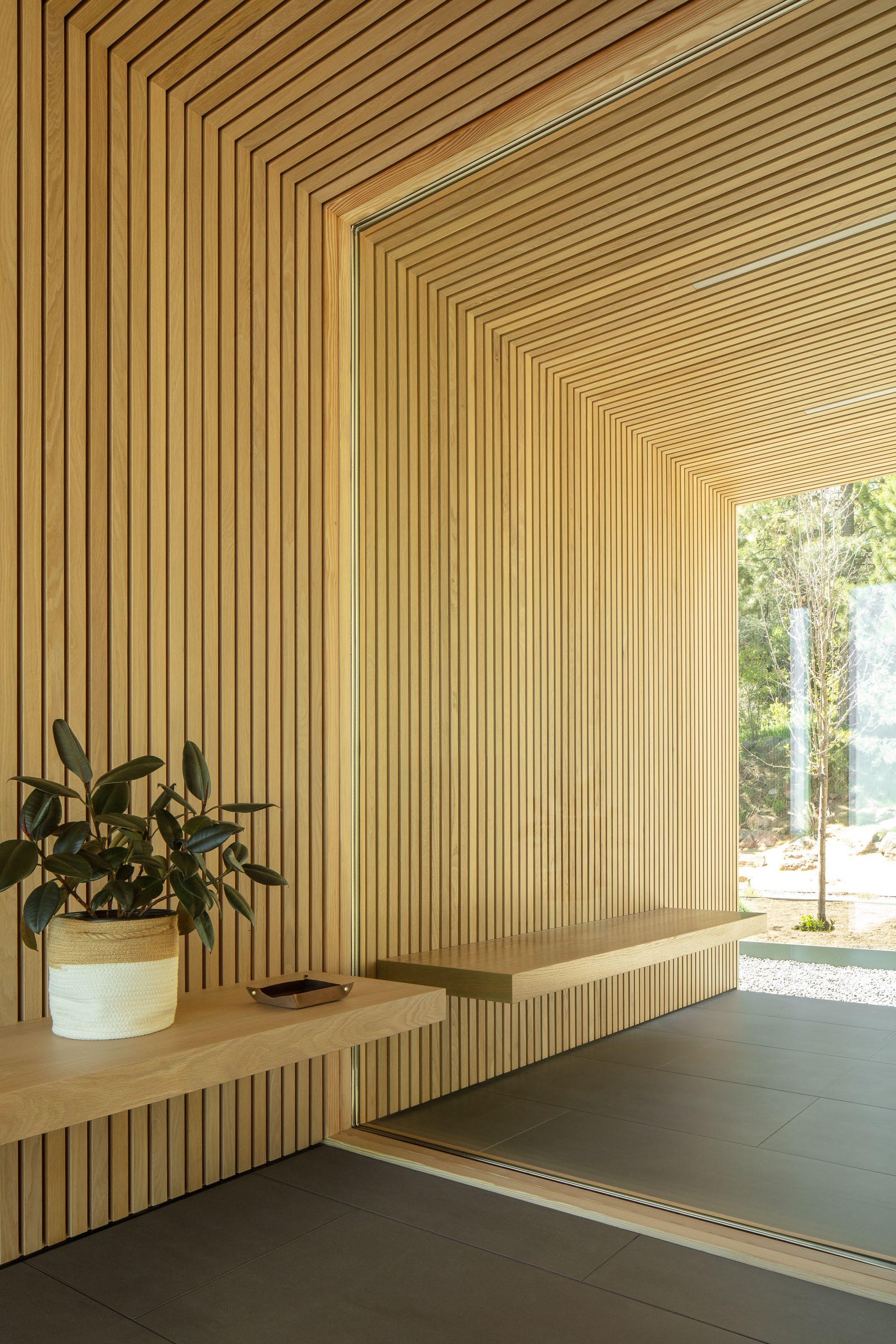 Incorporating wood elements thoughtfully, especially in areas of tactile contact, serves to soften the overall aesthetic, accentuating the ribbon-like effect created by the metal exterior Inside, crisp white walls provide a minimalist backdrop, ensuring that attention is drawn to the expansive glass panels framing the breathtaking landscape beyond To add warmth and create a compelling contrast with the cooler exterior materials, the wood was treated with a subtle whitewash, resulting in a muted appearance that complements the overall design. The interior finishes maintain a deliberate understated quality, emphasizing the connection with the Boulder mountain landscape through extensive glass surfaces