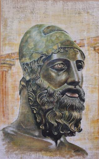 spontaneo cosicché la vis creativa possa avere il sopravvento sulla stessa tecnica, persino su quella originaria dell’antico scultore, forse Pitagora di Reggio o del nipote Sostrato e di altri ancora, perché traslata in un’altra moderna e contemporanea. Se infatti osserviamo i Bronzi di Riace, più volte ritratti e da prospettive differenti, notiamo gli effetti di quella luce che colpendo i muscoli, nell’originale ottenuti col bronzo e che sono a tutto tondo, nella pittura risaltano in una diversa visione che pur essendo bidimensionale, tale non sembra. Grazie alle sorgenti della luce, studiate dalla Sirio, durante le sue visite al museo, si imprime alla muscolatura quella sensazione di vitalità che nella scultura rimane canonizzata dal sapiente gioco della simmetria e dell’armonia operato dallo scultore antico, infatti il movimento in cui sono fermati per l’eterno è cristallizzato nell’idea della fierezza guerriera, invece, nella pittura della Sirio la loro fierezza diviene messaggio di riscatto di una terra e del mare che li ha riportati alla luce, mare che non è una tomba, questa volta, ma culla della rinascita, scrigno che serba tesori segreti che l’artista vuole aprire al mondo. È la creazione di un nuovo mito che viene narrato attraverso sfondi di antichi templi e dai volti dai lineamenti esaltati dai flussi di luce in dettagli di eccellenza, quali i riflessi che rilucono sul nastro che orna il capo del Bronzo A e che la pittrice evidenzia con morbida e determinata perizia o ancora i riccioli delle capigliature e delle barbe, ritessuti con saggio e preciso tratto, così come nella Testa del Filosofo e nella Testa di Basilea e ancor meglio nel Cronide di Artemisio, dal volto barbuto e la capigliatura cesellata, indice di divinità, che vengono filologicamente ripresi nella loro folta complessità. Ed ancora Elvira Sirio allarga il suo intento di riscatto dell’antico Mediterraneo anche all’interpretazione di altre opere come “Il Satiro danzante” che dal mare di Mazara dà lezione al mondo di sublime perfezione, in cui l’irruenza del movimento che sembra derogare dalle leggi dell’armonia classica, nel dipinto ha la sua esplicitazione in quanto danza nelle feste dionisiache al suono della cetra greca posta in secondo piano sulla colonna. L’artista estende la sua passione pittorica agli efebi: quello di Maratona reso nel particolare della testa reclinata dai capelli copiosi e ricci, quello di Fano, nella nudità degli eroi, quello di Anticitera nella sua maestosità, dai riflessi dorati qui resi con un’aura di con-