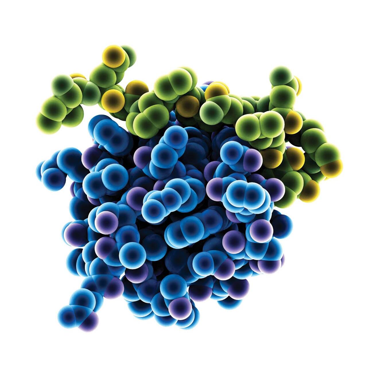 Molecular model of caspase-3, also known as apopain, complexed with an inhibitor. Caspase-3 is the predominant caspase involved in Alzheimer's disease, processing the protein that is associated with neuron death.