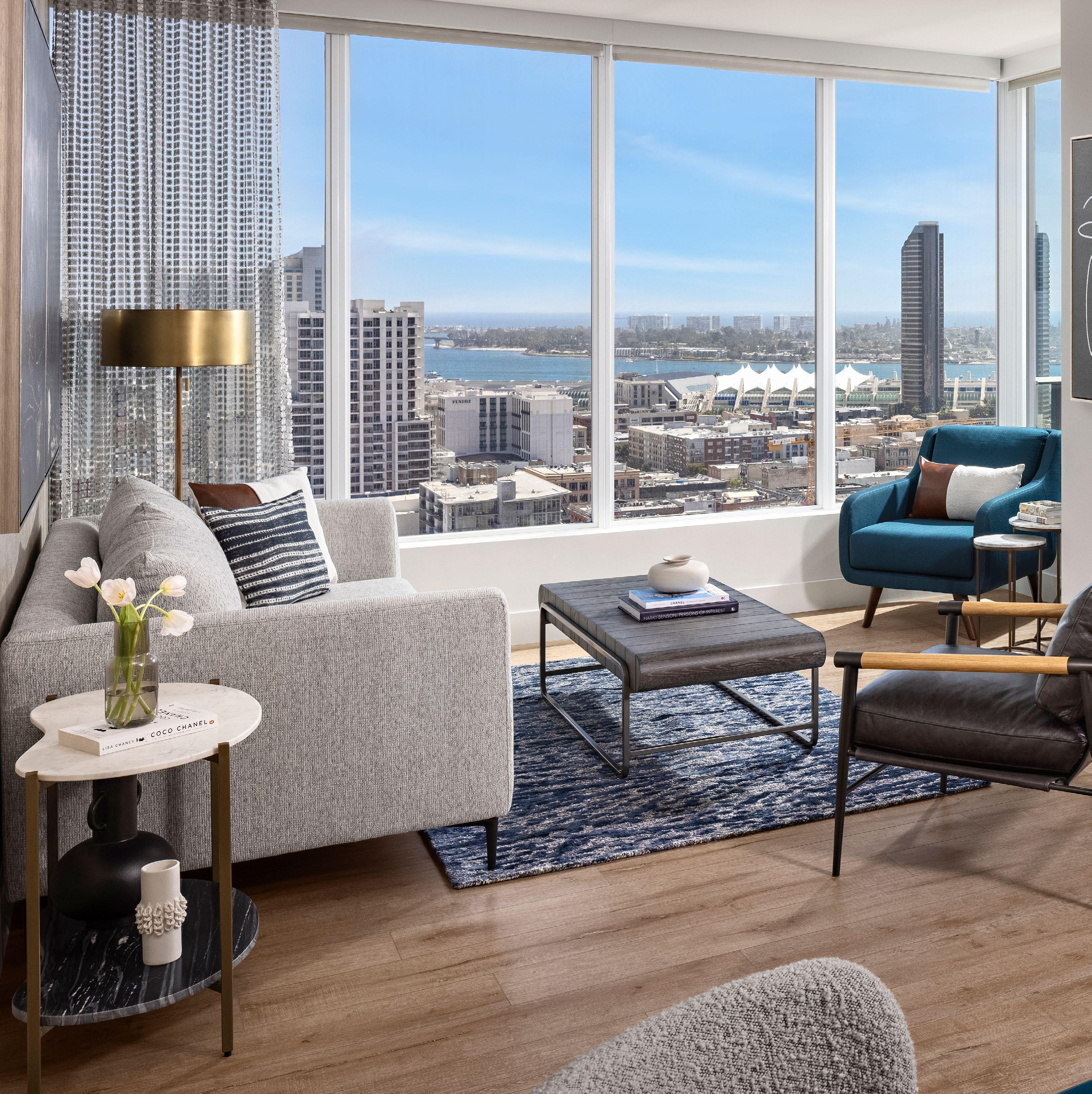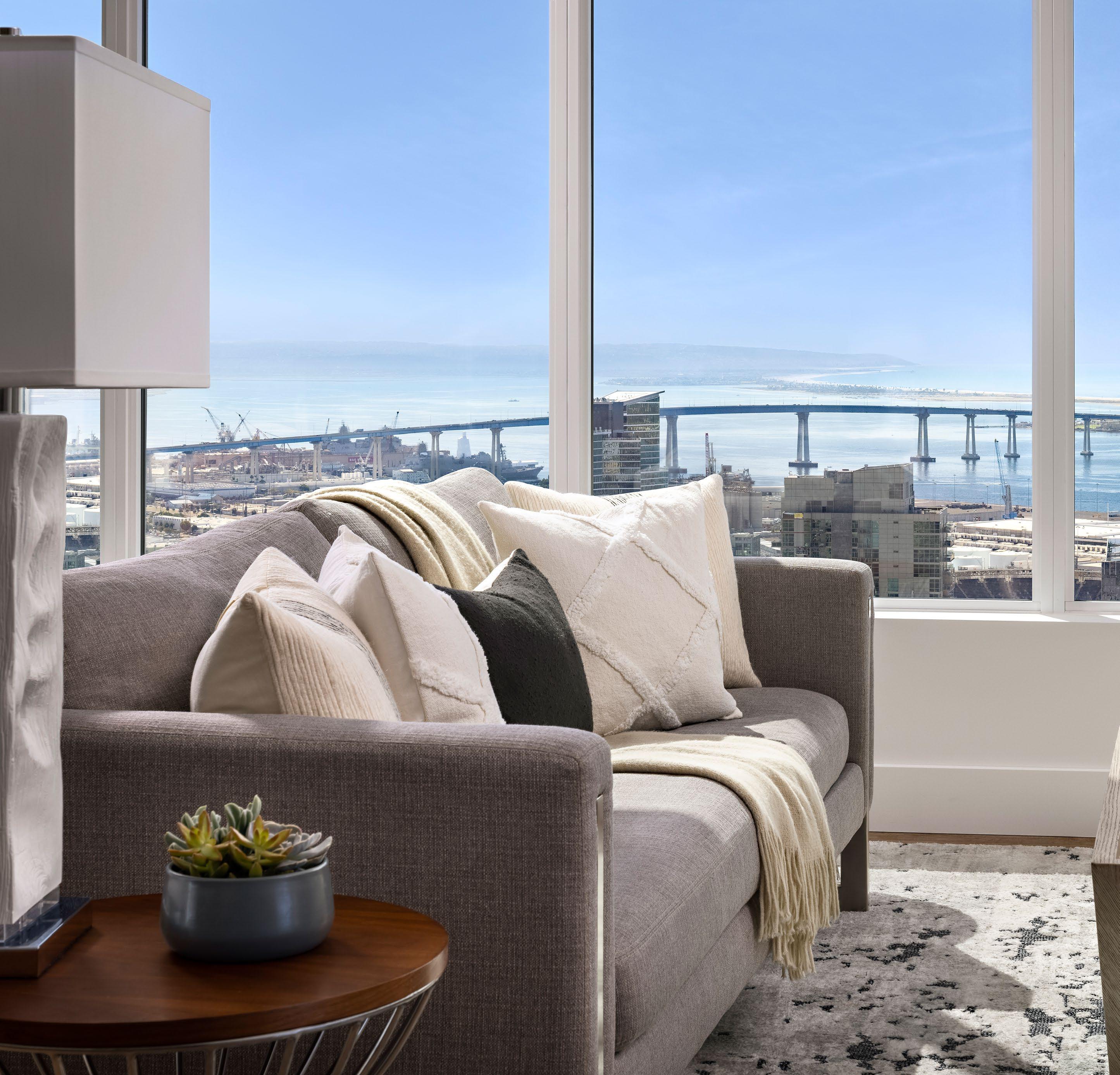 Diega’s unique dual-tower design creates a variety of residence sizes, layouts, elevations and views. From smart studios to spacious 1- and 2-bedrooms to lavish penthouse residences. The interiors are composed with crisp lines, contemporary finishes and appliances, and a choice of views that span from the downtown skyline to Balboa Park to San Diego Bay to the Pacific Ocean.