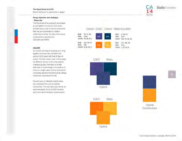 combined the visual identities of CLEO, the parent organization, and two webbased initiatives, STEPS TO JUSTICE and CLEO Connect, providing strategic and design services and guidance on a brand hierarchy, and preparation of design elements, both English and French, including other sub-brands.