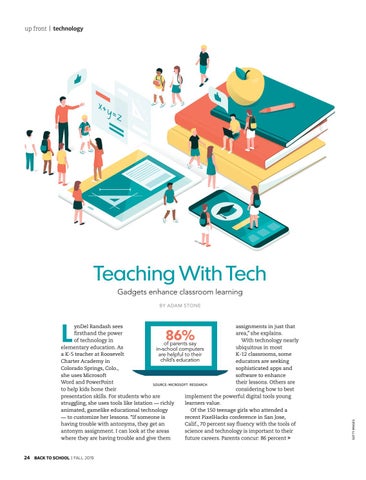 ynDel Randash sees assignments in just that firsthand the power area,” she explains. of technology in With technology nearly of parents say elementary education. As ubiquitous in most in-school computers a K-5 teacher at Roosevelt K-12 classrooms, some are helpful to their child’s education Charter Academy in educators are seeking Colorado Springs, Colo., sophisticated apps and she uses Microsoft software to enhance Word and PowerPoint their lessons. Others are SOURCE: MICROSOFT RESEARCH to help kids hone their considering how to best presentation skills. For students who are implement the powerful digital tools young struggling, she uses tools like Istation — richly learners value. animated, gamelike educational technology Of the 150 teenage girls who attended a — to customize her lessons. “If someone is recent PixelHacks conference in San Jose, having trouble with antonyms, they get an Calif., 70 percent say fluency with the tools of antonym assignment. I can look at the areas science and technology is important to their where they are having trouble and give them future careers. Parents concur: 86 percent >