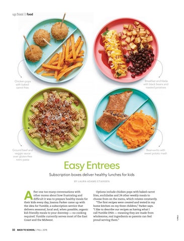 Options include chicken pops with baked carrot fries, enchiladas and 24 other weekly meals to choose from on the menu, which rotates constantly. “The first recipes were created and tested in my home kitchen on my three children,” Parker says. “I like to describe our recipes as having what I call Yumble DNA — meaning they are made from wholesome, real ingredients so parents can feel proud serving them.”