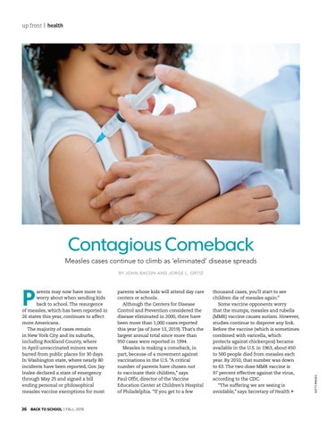 parents whose kids will attend day care centers or schools. Although the Centers for Disease Control and Prevention considered the disease eliminated in 2000, there have been more than 1,000 cases reported this year (as of June 13, 2019). That’s the largest annual total since more than 950 cases were reported in 1994. Measles is making a comeback, in part, because of a movement against vaccinations in the U.S. “A critical number of parents have chosen not to vaccinate their children,” says Paul Offit, director of the Vaccine Education Center at Children’s Hospital of Philadelphia. “If you get to a few