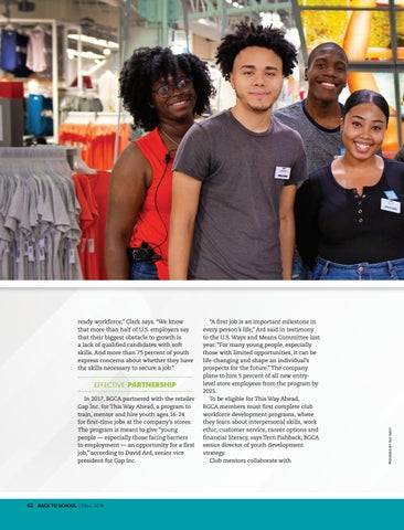 EFFECTIVE PARTNERSHIP In 2017, BGCA partnered with the retailer Gap Inc. for This Way Ahead, a program to train, mentor and hire youth ages 16-24 for first-time jobs at the company’s stores. The program is meant to give “young people — especially those facing barriers to employment — an opportunity for a first job,” according to David Ard, senior vice president for Gap Inc.