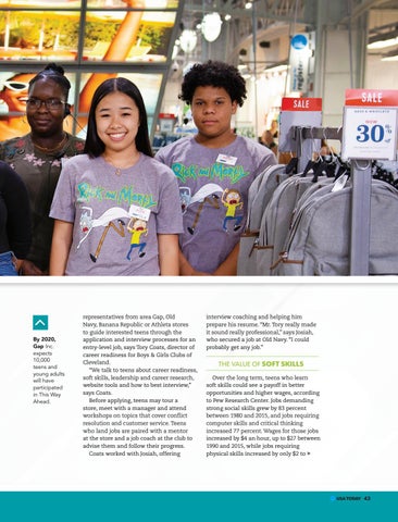 representatives from area Gap, Old Navy, Banana Republic or Athleta stores to guide interested teens through the application and interview processes for an entry-level job, says Tory Coats, director of career readiness for Boys & Girls Clubs of Cleveland. “We talk to teens about career readiness, soft skills, leadership and career research, website tools and how to best interview,” says Coats. Before applying, teens may tour a store, meet with a manager and attend workshops on topics that cover conflict resolution and customer service. Teens who land jobs are paired with a mentor at the store and a job coach at the club to advise them and follow their progress. Coats worked with Josiah, offering