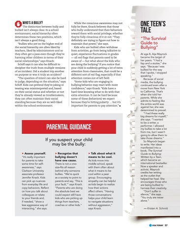 uRecognize that bullying doesn’t have one cause. There is not a onesize-fits all reason behind why someone bullies. “We’re quick as a society to point to parents and say, ‘This is your fault,’” says Knack. “Parents who are doing the absolute best we could expect still have kids who are picking up things from teachers, coaches or other kids.”