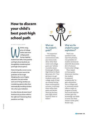 That’s one question to ask, says Terry Brasier, vice president of student services for Asheville-Buncombe (N.C.) Technical Community College. Then, based on these goals, determine whether the student is prepared academically “to gain admissions into a college and/ or university which offers a major or program of study that would help the student gain the knowledge and skills to enter into their chosen career path,” Brasier says.
