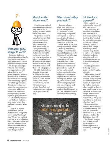 What about going straight to work? For some students, going to work immediately after high school is the right option, and it can be combined with education. On-the-job training is valuable, Brasier notes, but suggests teens still take a class or two. “I would encourage students who choose to enter the workforce to also strongly consider seeking highereducation opportunities through the college and university system as most jobs require additional educational attainment (above) the high school degree to gain promotions and job mobility,” he says. At the least, students need a plan before they graduate, no matter what it is. “Our goal as school counselors is for our students to be college and career ready,” Rumbaugh says. “We are not pushing everyone to go to college or even a four-year college. We think it’s very important that our students have a post high-school plan after they graduate.”
