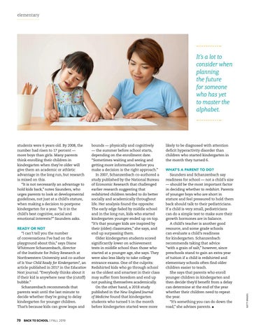 READY OR NOT “I can’t tell you the number of conversations I’ve had on the playground about this,” says Diane Whitmore Schanzenbach, director of the Institute for Policy Research at Northwestern University and co-author of Is Your Child Ready for Kindergarten?, an article published in 2017 in the Education Next journal. “Everybody thinks about it if their kid is anywhere near the (cutoff) bubble.” Schanzenbach recommends that parents wait until the last minute to decide whether they’re going to delay kindergarten for younger children. That’s because kids can grow leaps and