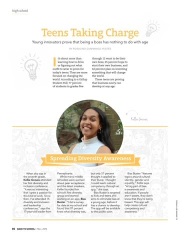 Pennsylvania. While many middle schoolers were worried about peer acceptance and the latest sneakers, Kellie founded her school’s first diversity group and started working on an app, Bias Buster. “I did a survey for data at my school and found that 97 percent knew what diversity was,