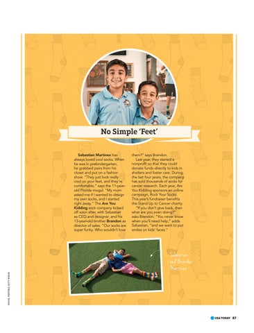 Sebastian Martinez has always loved cool socks. When he was in prekindergarten, he grabbed pairs from his closet and put on a fashion show. “They just look really cool on your feet, and they’re comfortable,” says the 11-yearold Florida mogul. “My mom asked me if I wanted to design my own socks, and I started right away.” The Are You Kidding sock company kicked off soon after, with Sebastian as CEO and designer, and his 13-year-old brother Brandon as director of sales. ”Our socks are super funky. Who wouldn’t love