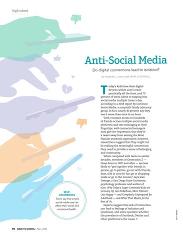 oday’s kids have their digital devices within arm’s reach practically all the time, and 70 percent of teens admit to tapping into social media multiple times a day, according to a 2018 report by Common Sense Media, a nonprofit family advocacy group. In fact, nearly 40 percent say they use it more than once in an hour. With constant access to hundreds of friends across multiple social media platforms and text messaging at their fingertips, well-connected teenagers may give the impression that they’re a tweet away from seizing the Most Popular yearbook superlative; however, researchers suggest that they might not be making the meaningful connections they need to provide a sense of belonging and community. When compared with teens in earlier decades, members of Generation Z — those born in 1997 and after — are less likely to “get together with friends in person, go to parties, go out with friends, date, ride in cars for fun, go to shopping malls or go to the movies,” says Jean Twenge, a San Diego State University psychology professor and author of iGen: Why Today’s Super-Connected Kids are Growing Up Less Rebellious, More Tolerant, Less Happy — and Completely Unprepared for Adulthood — and What That Means for the Rest of Us. Experts suggest this lack of interaction can lead to feelings of isolation and loneliness, and some question whether the prevalence of Facebook, Twitter and other platforms is the cause. >