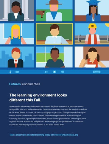 The learning environment looks different this Fall. Access to education to explain ďŹ nancial markets and the global economy is as important as ever. Designed for educators and students alike, Futures Fundamentals illustrates the impact futures have on the world around us – from car loans, to mortgages, to groceries. Through easy to follow digital content, interactive tools and videos, Futures Fundamentals provides free, standards-aligned e-learning resources explaining futures markets, core economic principles and how they play a role in global ďŹ nancial markets and everyday life. We believe people everywhere need to understand futures and how they impact the economics of the world around them.
