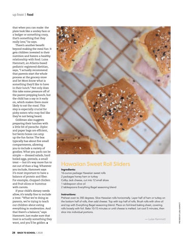 that when you can make the plate look like a smiley face or a badger or something crazy, that’s something that they really love,” he says. There’s another benefit beyond making the meal fun: It gets children invested in their nutrition and fosters a healthy relationship with food. Luisa Hammett, an Atlanta-based pediatric registered dietitian, says, “I actually recommend that parents start the whole process at the grocery store and let Mom know what is something they’d like to have in their lunch.” Not only does this take some pressure off of the parent prepping lunch, but the child has a say in it early on, which makes them more likely to eat the meal. This step is especially crucial for picky eaters who may feel like they’re not being heard. Goldman also suggests preparing their lunches with a little bit of panache. Ziploc and paper bags are efficient, but bento boxes can amp up the fun factor. The box typically has about five small compartments, allowing you to include a variety of goodies. What you pack can be simple — dressed salads, hard boiled eggs, pretzels, a small treat — but it’s way more fun to eat out of than a bag. Whatever you include, Hammett says it’s most important to have a balance of protein and fiber. For example, chopped chicken and fruit slices or hummus with carrots. If your child’s dietary needs allow, it’s totally fine to include a treat. “What we’re doing as parents, we’re trying to teach our children about eating everything in moderation. And that there’s a balance,” says Hammett. Just make sure that treat is actually something they want, and you’ll be golden. l