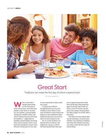it was a reminder of how much she cared. I carried my mother’s thoughtfulness into my own children’s lives. When it was time for them to start school, we began our own traditions that I hoped would mean as much to them as mine meant to me. For us, it was all about our favorite pizza at dinner and High/Low, a game in which the kids shared their best and