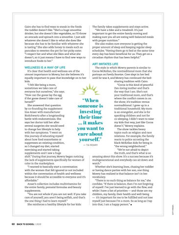 The style in which Mowry parents is similar to It’s clear that health and wellness are of the Cocoa McKellan, the nontraditional mom that she utmost importance to Mowry, but she believes it’s portrays on Family Reunion. Cree slept in her bed equally important to pass that knowledge on to her until he was 4, and Mowry has continued the bedkids. sharing tradition with Cairo. “I felt like being a mom, “Cocoa is this kind of peaceful sometimes we take care of Zen-loving mother and that’s everyone but ourselves,” she says. the way that I am. She’s not “How can the goose lay the egg your traditional mom, and that’s if the goose doesn’t take care of where the conflict comes in on herself?” the show; it’s tradition versus She answered that question nontraditional. I grew up in a by co-founding the supplement traditional household. My mom line Anser with manufacturer is an evangelist, and she is for BioSchwartz after a longstanding spanking children and not for battle with endometriosis. She co-sleeping. I didn’t want to raise says her doctor told her after my kids that way, just like Cocoa several surgeries she would need doesn’t,” Mowry explains. to change her lifestyle to help The show tackles heavy with her symptoms. “I went on topics such as religion and race this journey of educating myself relations. For example, the family about how food exacerbates or reacts to police accosting the suppresses an existing condition, black McKellan kids for being in — TIA MOWRY so I changed my diet, started “the wrong neighborhood.” exercising and started taking “We’re not afraid to depict supplements and I saw a huge the truth, and that’s what is so shift.” During that journey, Mowry began noticing amazing about this show. It’s a success because it’s the lack of supplements specifically for women of multigenerational and everybody can sit down and color in the marketplace. watch.” “I wanted to basically start a conversation Whether she’s learning lines, chasing her toddler with the women that felt ignored or not included or having dance parties with her son, one thing within the conversation of health and wellness Mowry has realized is that balance isn’t in her because it should be accessible to everyone and it’s vocabulary. affordable.” “There is no such thing as balance for me,” she Anser’s collection includes multivitamins for confides. “If there is balance, then I’m not forgiving the entire family, prenatal formulas and beauty of myself. I’ve just learned to go with the flow, and supplements. while I have a list of priorities — and those are my “You are not whole if you are not well. If you take children, my family, their health and well-being care of yourself, you aren’t being selfish, and that’s — it’s important for me to be fulfilled and not lose the one thing I had to learn myself.” myself just because I’m a mom. So as long as I tap She reinforces a healthy lifestyle for her kids: into that, I am a happy person.” l