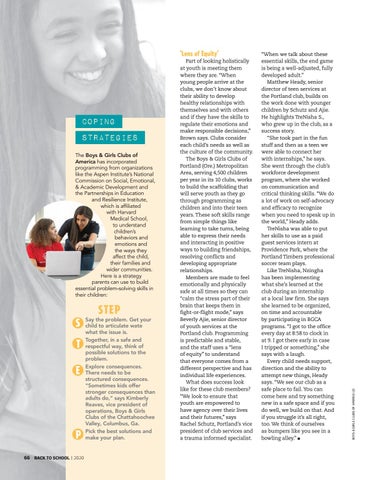 “When we talk about these essential skills, the end game is being a well-adjusted, fully developed adult.” Matthew Heady, senior director of teen services at the Portland club, builds on the work done with younger children by Schutz and Ajie. He highlights TreNisha S., who grew up in the club, as a success story. “She took part in the fun stuff and then as a teen we were able to connect her with internships,” he says. She went through the club’s workforce development program, where she worked on communication and critical thinking skills. “We do a lot of work on self-advocacy and efficacy to recognize when you need to speak up in the world,” Heady adds. TreNisha was able to put her skills to use as a paid guest services intern at Providence Park, where the Portland Timbers professional soccer team plays. Like TreNisha, Nzingha has been implementing what she’s learned at the club during an internship at a local law firm. She says she learned to be organized, on time and accountable by participating in BGCA programs. “I got to the office every day at 8:58 to clock in at 9. I got there early in case I tripped or something,” she says with a laugh. Every child needs support, direction and the ability to attempt new things, Heady says. “We see our club as a safe place to fail. You can come here and try something new in a safe space and if you do well, we build on that. And if you struggle it’s all right, too. We think of ourselves as bumpers like you see in a bowling alley.” l