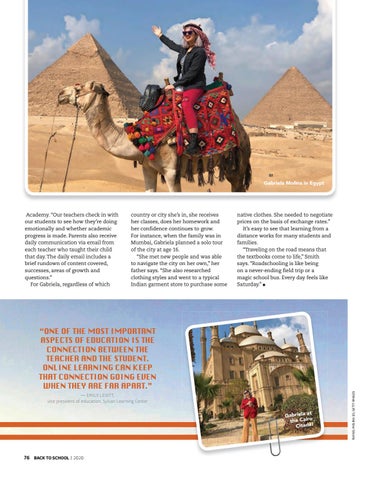 native clothes. She needed to negotiate prices on the basis of exchange rates.” It’s easy to see that learning from a distance works for many students and families. “Traveling on the road means that the textbooks come to life,” Smith says. “Roadschooling is like being on a never-ending field trip or a magic school bus. Every day feels like Saturday.” l
