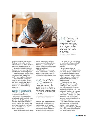 Washington who cites research findings that forming cursive letters improves a child’s ability to spell and compose sentences. “This doesn’t mean you don’t let children use technology; it’s the world we live in,” Berninger says. She says children need to learn both cursive and keyboarding skills — starting in kindergarten. “The benefits of typing come later, in the sixth grade and up,” she says. “To think that typing alone can substitute is just a mistake. It’s not scientifically supported.” SURPRISE TO SOME PARENTS Kathleen S. Wright, an independent educational consultant in Columbus, Ohio, says cursive is still taught in many private schools. Often, parents of children in public schools don’t realize that the skill is no longer being taught until they perhaps ask their child to read a letter from a grandparent. “Most people assume it is being