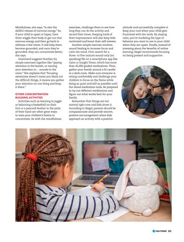 Mindfulness, she says, “is also the skillful release of nervous energy.” So, if your child is upset or hyper, have them wiggle their body to get out that nervous energy and then go back to stillness a few times. It will help them become grounded, and once they’re grounded, they can concentrate better, she says. Greenland suggests families try simple exercises together like “paying attention to the breath, or moving your attention to ... sounds in the room.” She explains that “focusing awareness doesn’t mean you block out the difficult things; it means you gather your attention on one thing and keep it there.” OTHER CONCENTRATIONBUILDING ACTIVITIES Activities such as learning to juggle or balancing a basketball on their foot or a peacock feather in the palm of their hand are other great ways to train your children’s brains to concentrate. As with the mindfulness