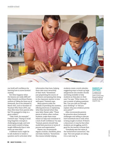 information they have, helping them take more ownership of their work. “Sometimes just pinpointing the source of confusion and passing that along to the classroom teacher is time well spent,” Freireich says. Many parents make the mistake of providing the answers, offering shortcuts or explaining what they learned when they were kids, Platzer adds. “These pieces of advice often confuse students, make them more reliant on help and contribute to a lack of self-confidence,” he says. “Instead, parents should help model best practices in terms of process and organization.” Platzer, too, recommends regular routines, checklists, plans and daily rhythms. “Sometimes this means initially helping