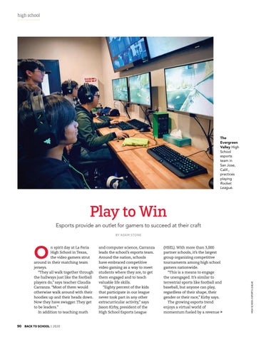 and computer science, Carranza leads the school’s esports team. Around the nation, schools have embraced competitive video gaming as a way to meet students where they are, to get them engaged and to teach valuable life skills. “Eighty percent of the kids that participate in our league never took part in any other extracurricular activity,” says Jason Kirby, president of the High School Esports League