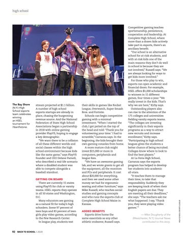 their skills in games like Rocket League, Overwatch, Super Smash Bros. and Fortnite. Schools can begin competitive gaming with a minimal investment. “When I started the club, I got patted on the top of the head and told: ‘Thank you for volunteering your time.’ I had to scramble,” Carranza says. In the beginning, the kids brought their own gaming consoles from home. A more mature club might invest $15,000 or more in computers, peripherals and league fees. “We have an awesome gaming lab, and we wrote grants to get all the equipment, all the monitors and PCs and peripherals. It cost about $20,000 for everything, and then we used some other money we had for ergonomic seating and other furniture,” says Mike Russell, who teaches social studies and gaming concepts and who runs the esports club at Complete High School Maize in Kansas. ADDED BENEFITS Esports drive home the same essentials as any other athletic endeavor, Russell says.