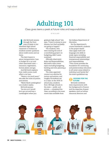 graduate high school,” she says, “I hate to stomp on your dreams, but that’s probably not going to happen.” The students, who were nearing the end of a monthslong project on budgeting, didn’t seem surprised. Officially titled Adult Roles and Responsibilities, McComb’s class covers topics including budgeting, banking and even planning a wedding. The state-approved course is an elective for juniors and seniors, and roughly 30 students are in a class. In the 2018-19 school year, students from 184 high schools in the state — public and private — completed the class, according to the most recent data available from