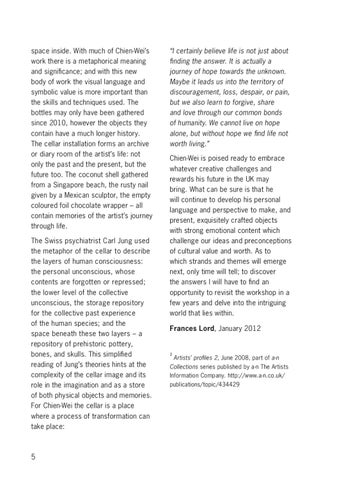 space inside. With much of Chien-Wei’s work there is a metaphorical meaning and significance; and with this new body of work the visual language and symbolic value is more important than the skills and techniques used. The bottles may only have been gathered since 2010, however the objects they contain have a much longer history. The cellar installation forms an archive or diary room of the artist’s life: not only the past and the present, but the future too. The coconut shell gathered from a Singapore beach, the rusty nail given by a Mexican sculptor, the empty coloured foil chocolate wrapper – all contain memories of the artist’s journey through life. The Swiss psychiatrist Carl Jung used the metaphor of the cellar to describe the layers of human consciousness: the personal unconscious, whose contents are forgotten or repressed; the lower level of the collective unconscious, the storage repository for the collective past experience of the human species; and the space beneath these two layers – a repository of prehistoric pottery, bones, and skulls. This simplified reading of Jung’s theories hints at the complexity of the cellar image and its role in the imagination and as a store of both physical objects and memories. For Chien-Wei the cellar is a place where a process of transformation can take place: