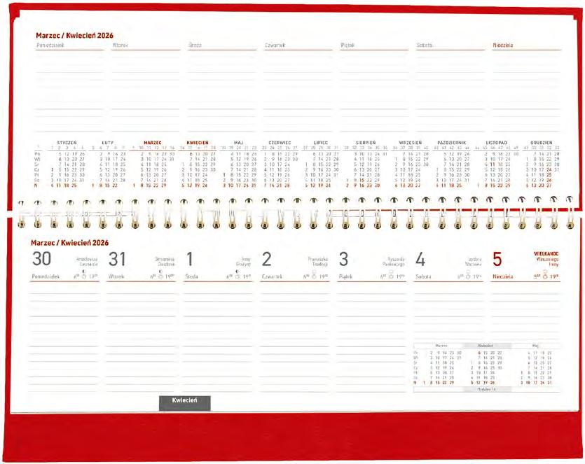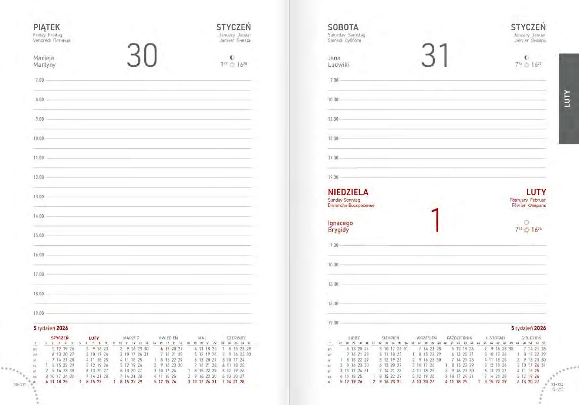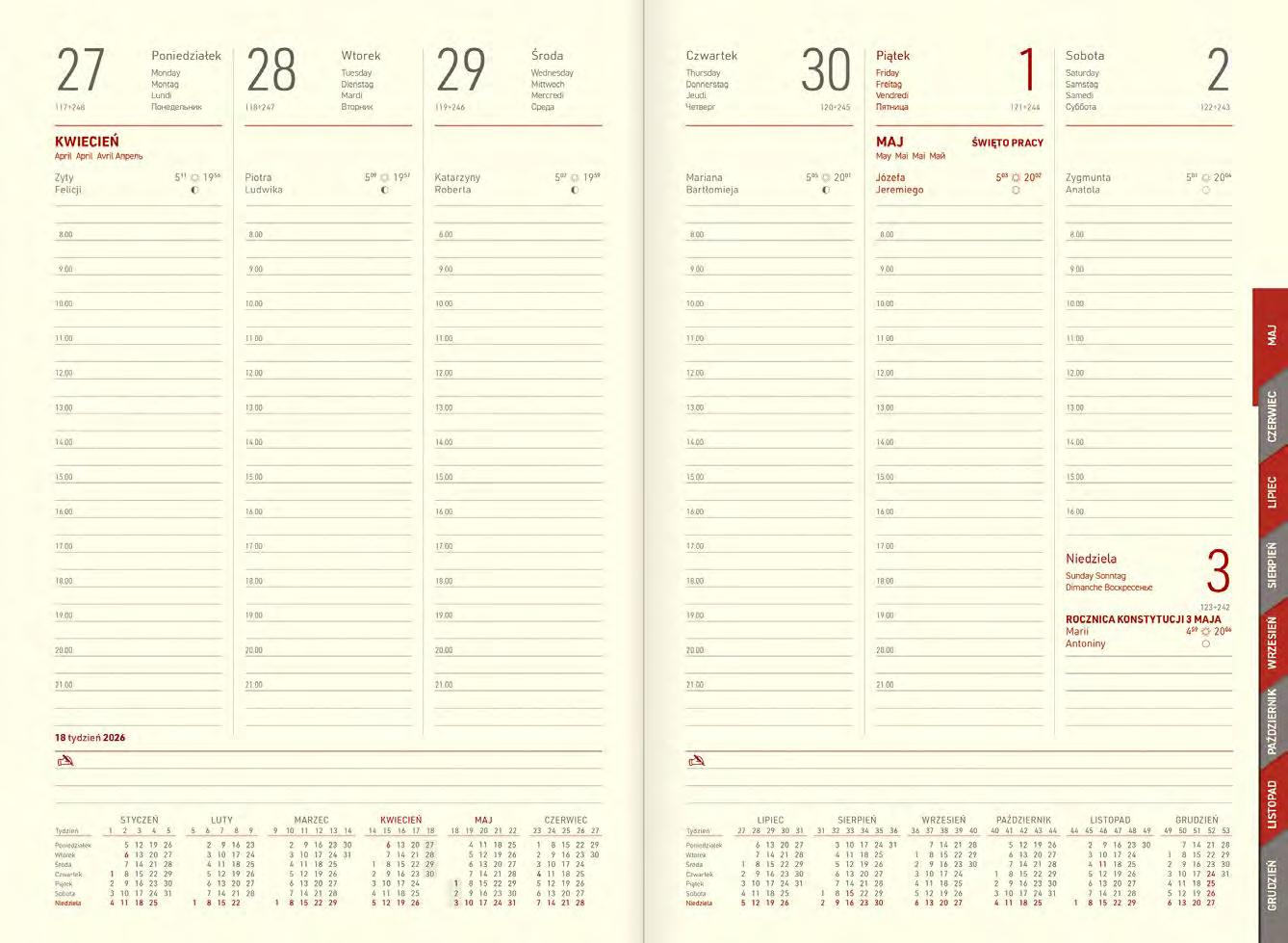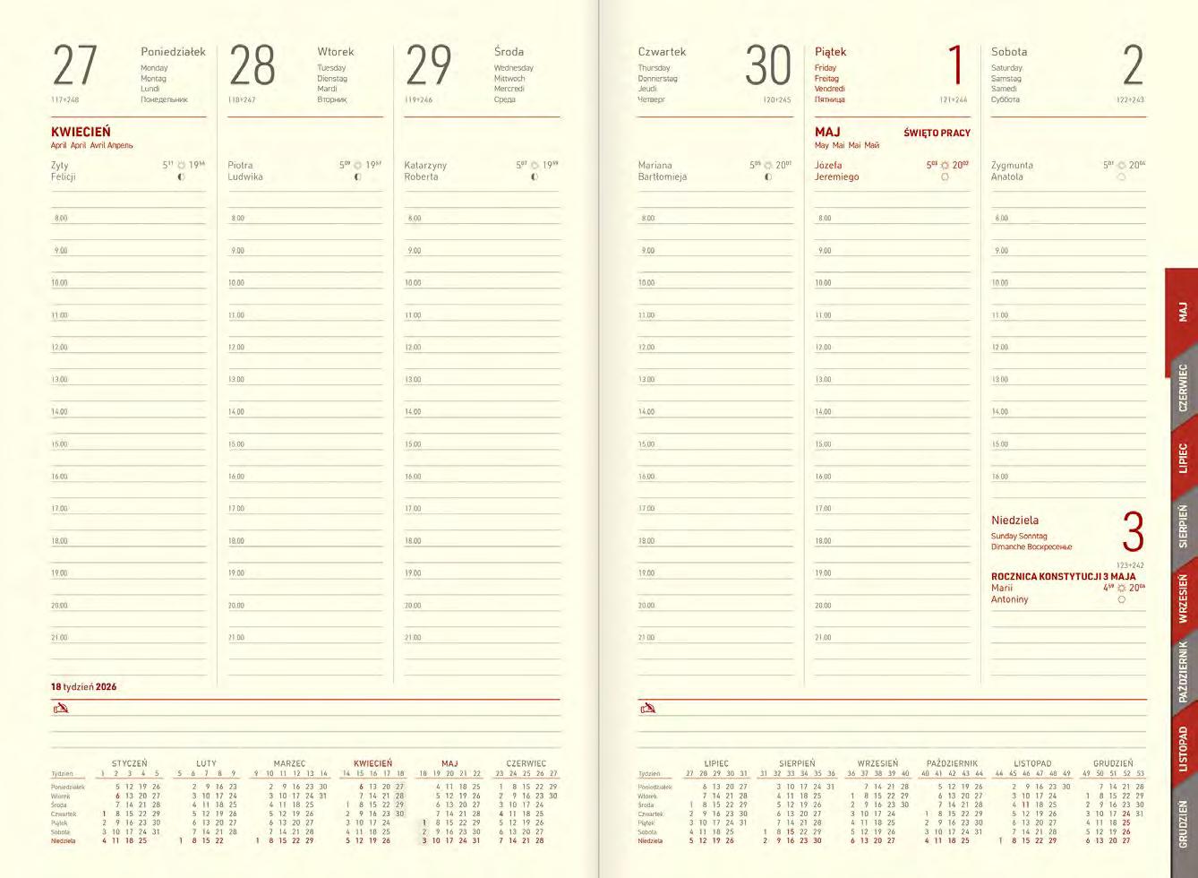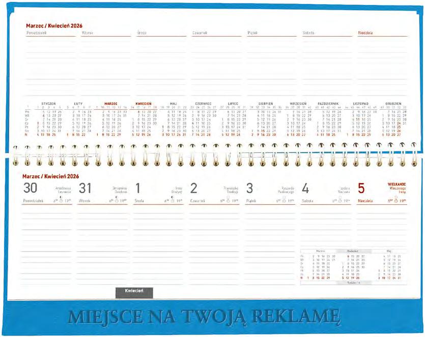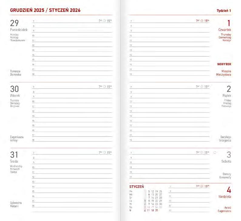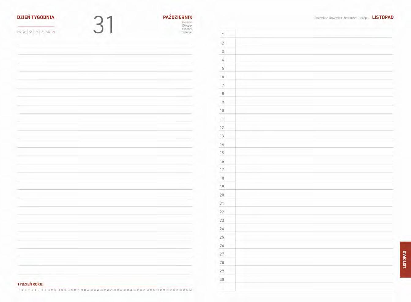 y k ażda strona posiada miejsce na wpisanie dnia tygodnia oraz roku; y pr zed każdym miesiącem skrócony, miesięczny planer;