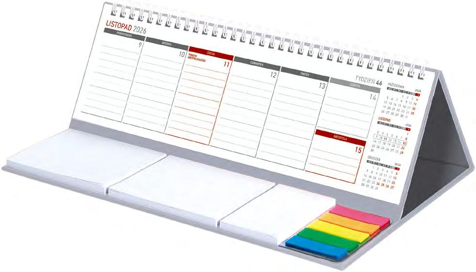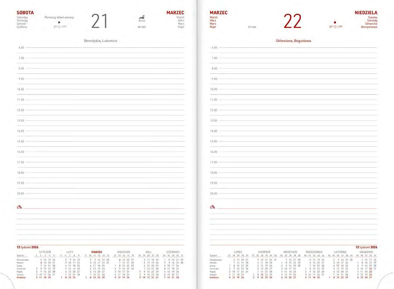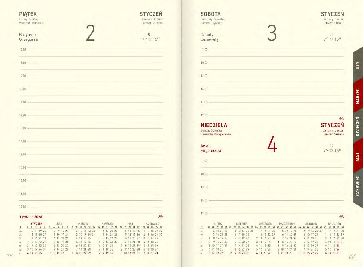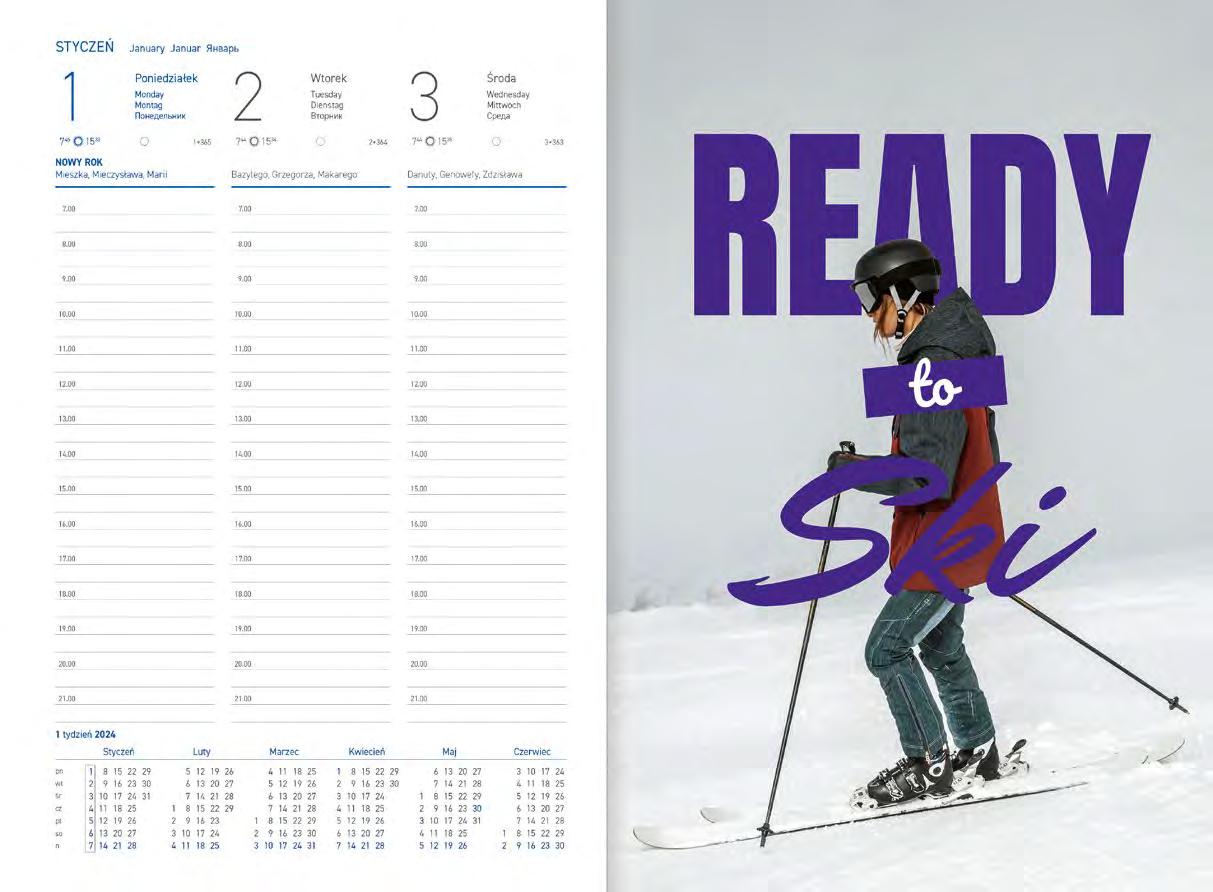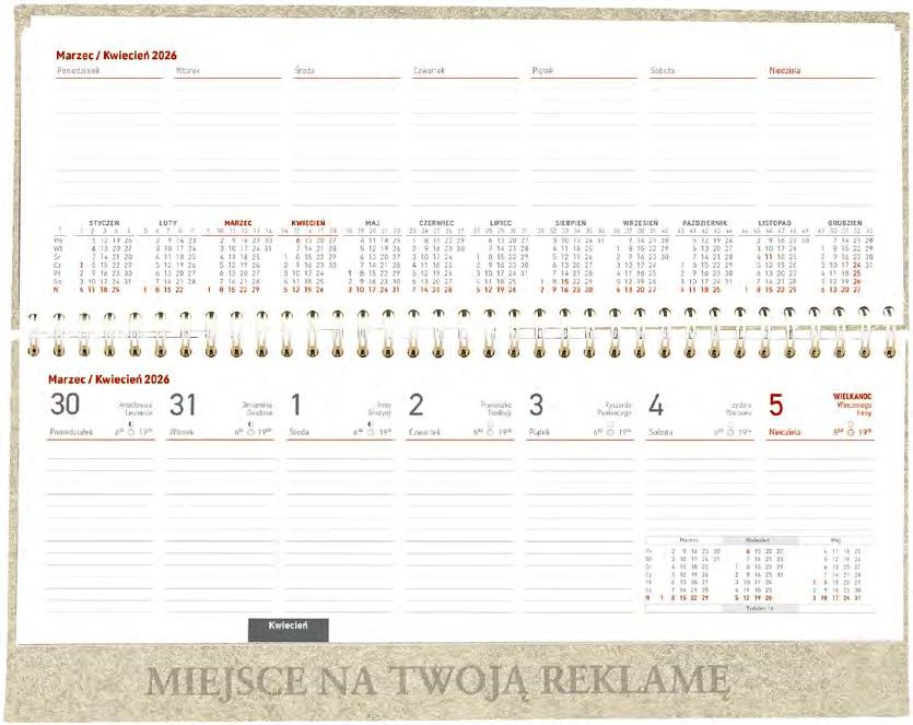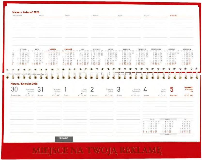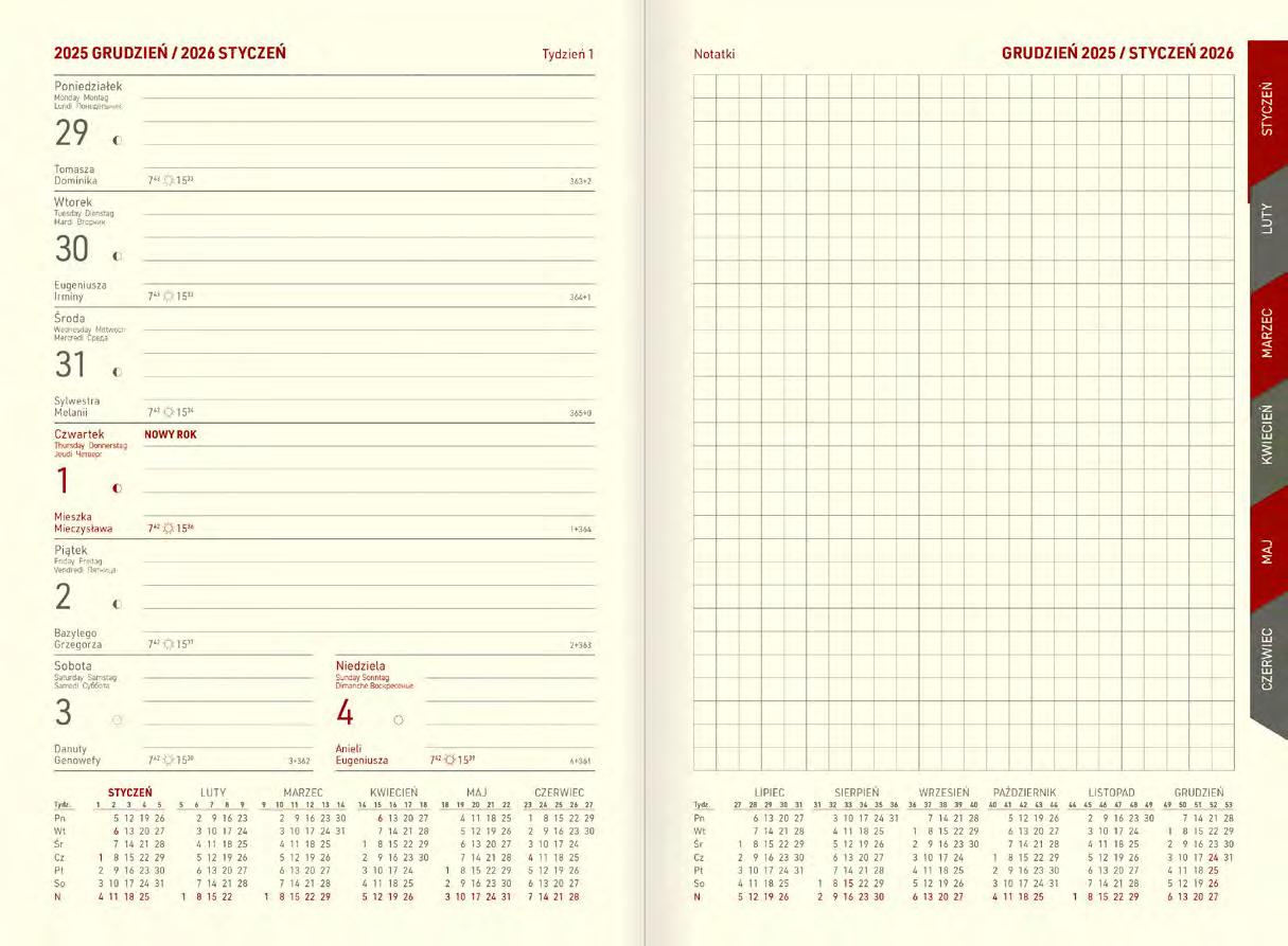 y k ażda strona posiada miejsce na wpisanie dnia tygodnia oraz roku; y pr zed każdym miesiącem skrócony, miesięczny planer;