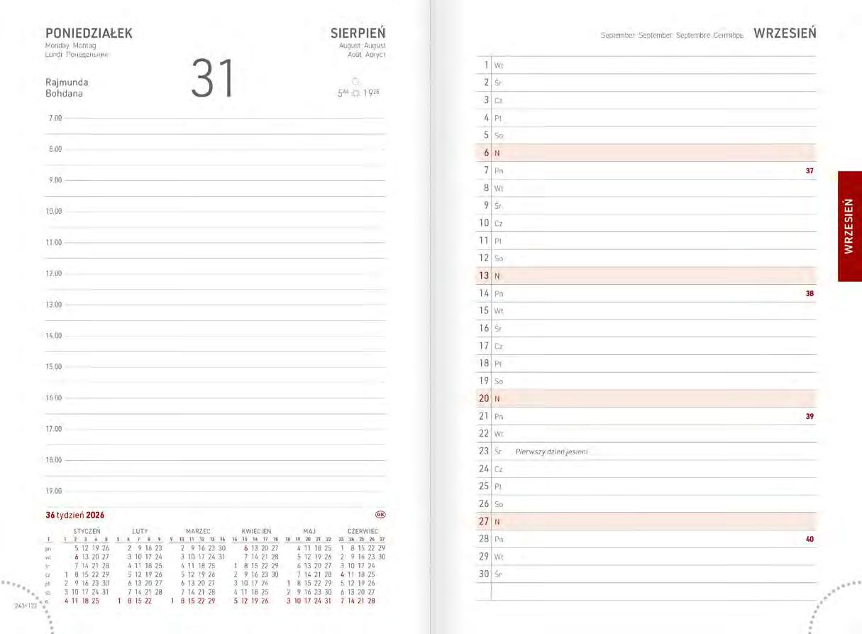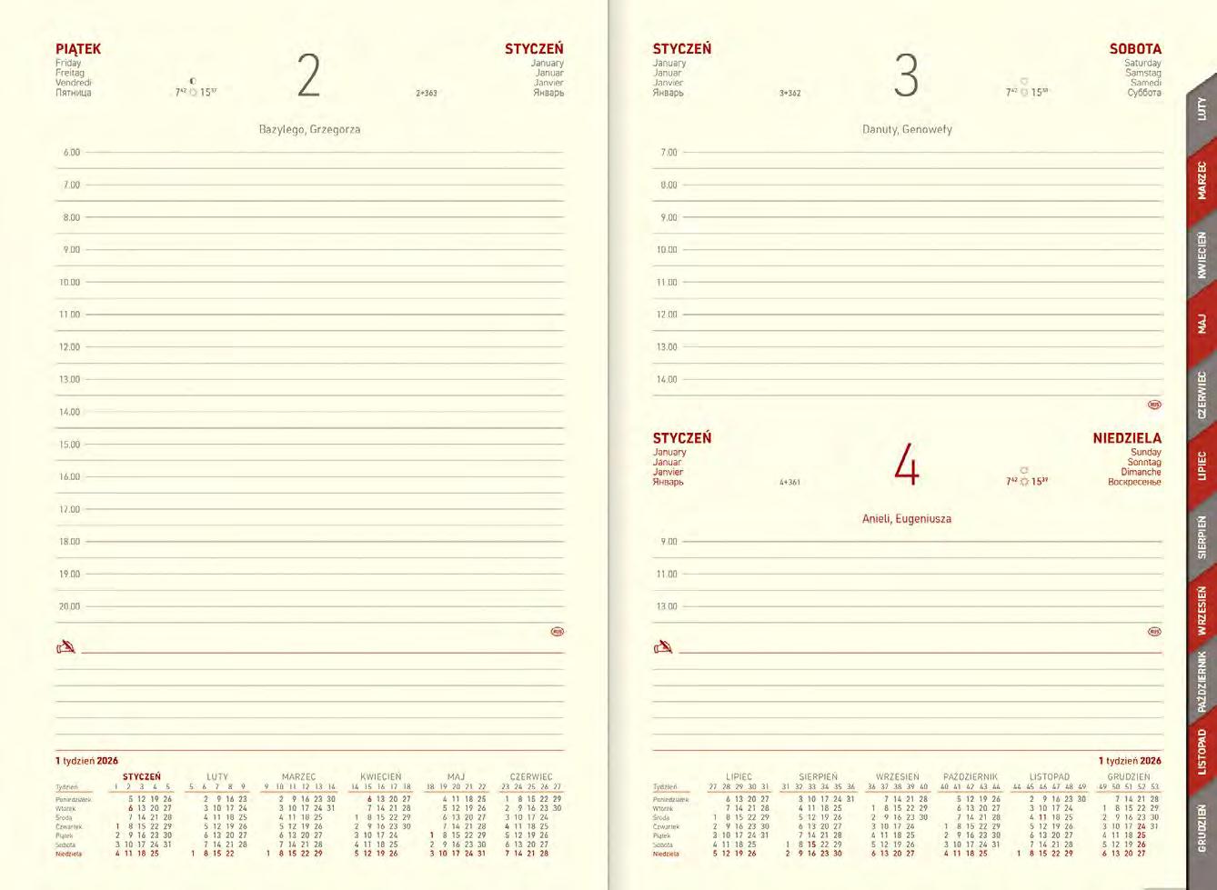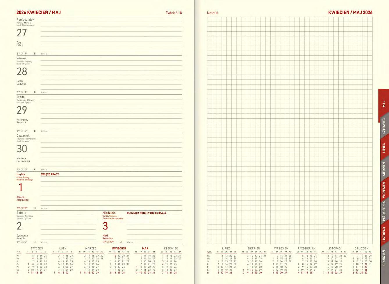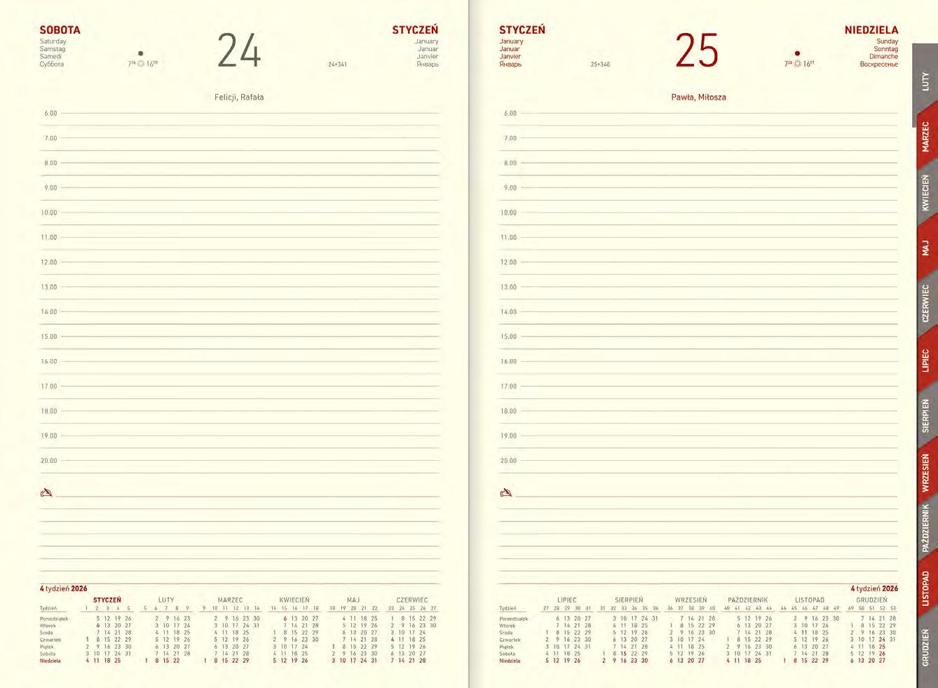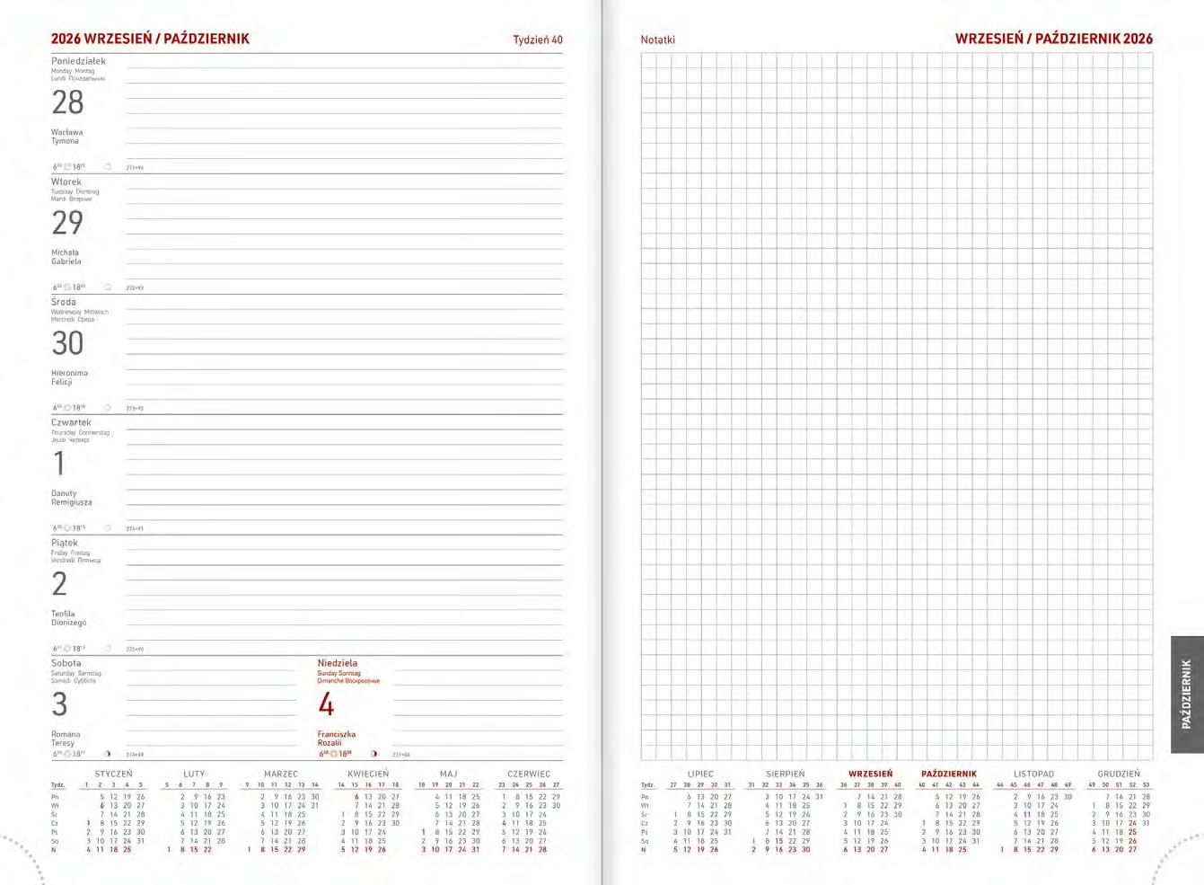 y k ażda strona posiada miejsce na wpisanie dnia tygodnia oraz roku; y pr zed każdym miesiącem skrócony, miesięczny planer;