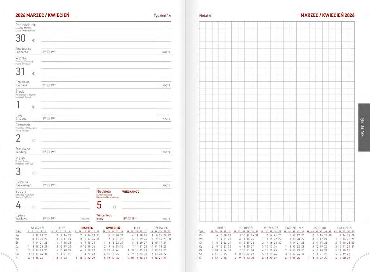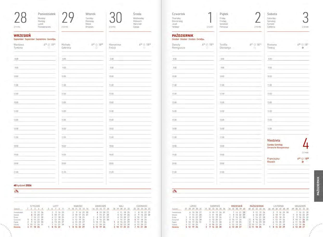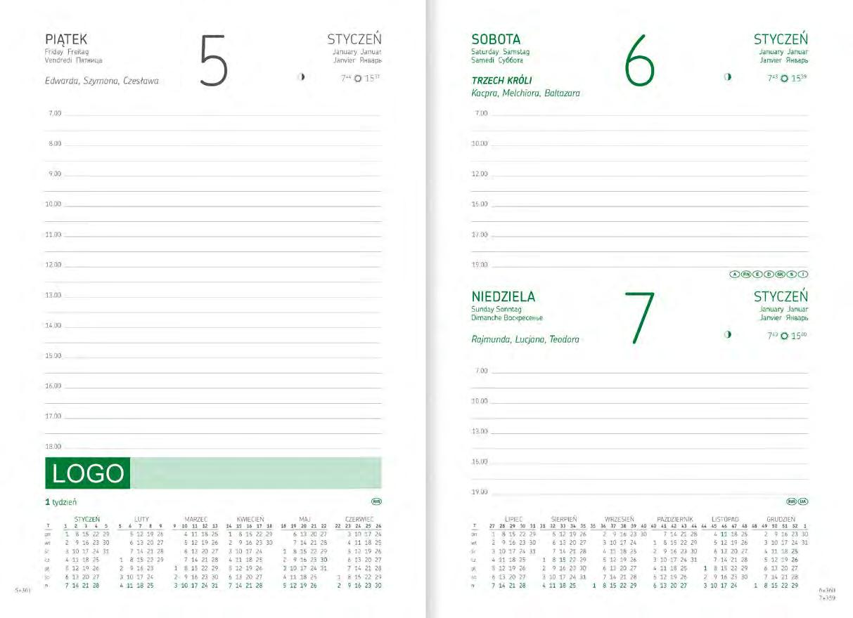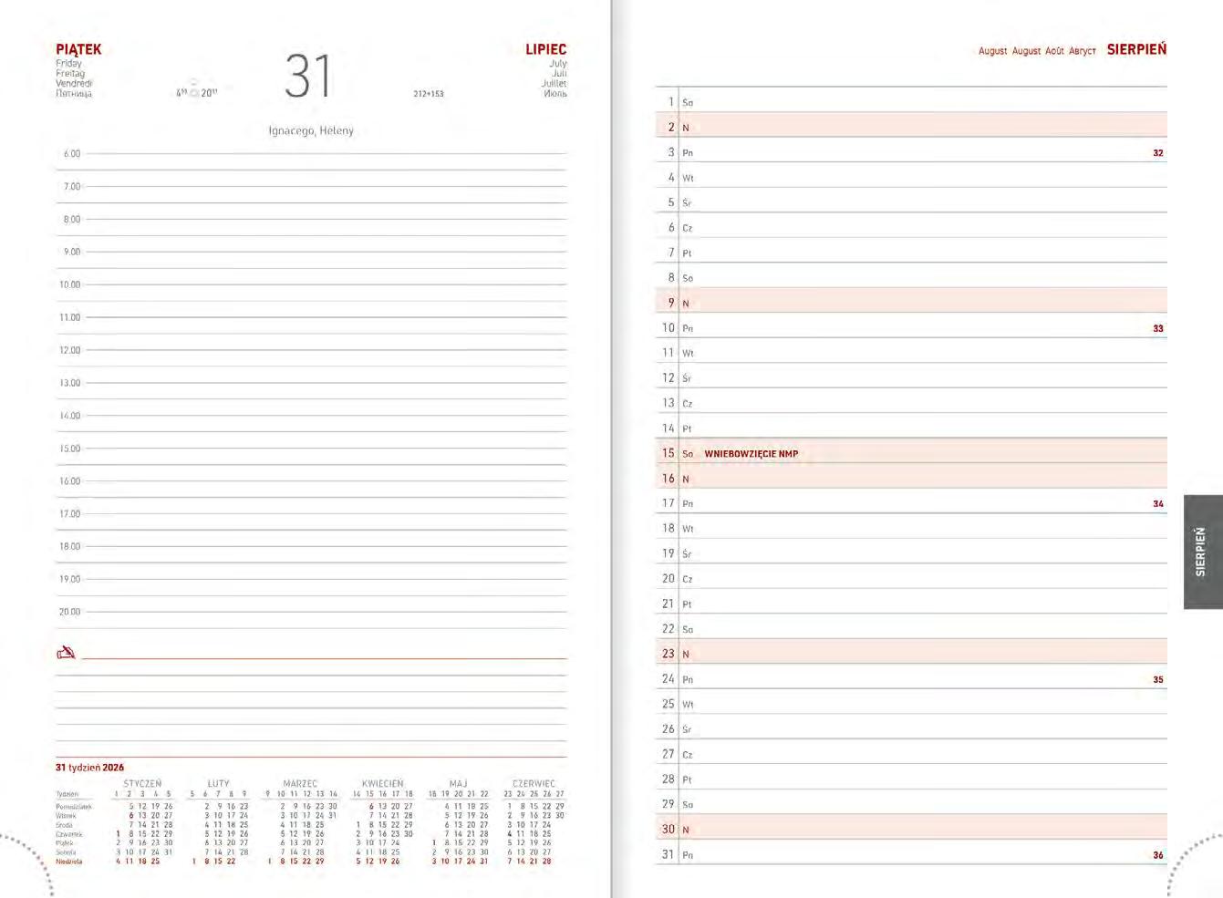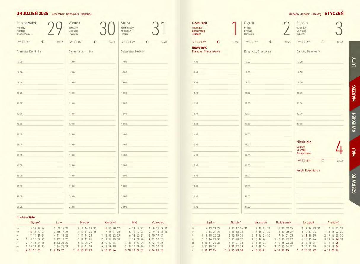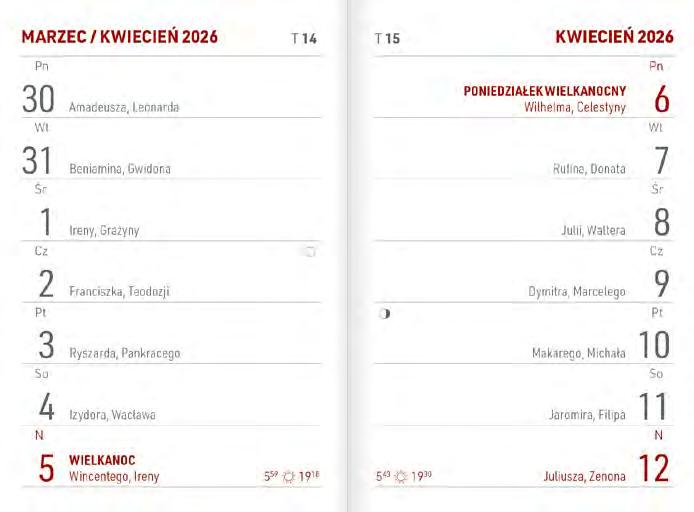 y k ażda strona posiada miejsce na wpisanie dnia tygodnia oraz roku; y pr zed każdym miesiącem skrócony, miesięczny planer;