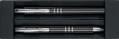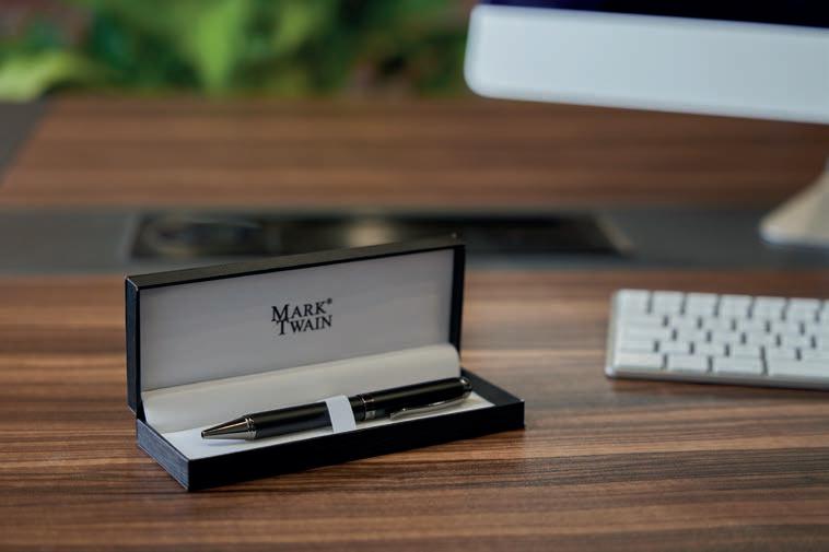Zestaw piśmienniczy marki Mark Twain, składający się z długopisu z mechanizmem obrotowym oraz pióra kulkowego. Oba przyrządy mają czarną, matową obudowę oraz błyszczące czarne wstawki. Pakowane w etui wyściełane satyną.