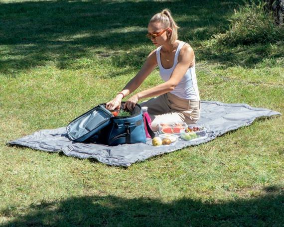 Składany koc piknikowy Schwarzwolf, którego możesz użyć np. podczas wycieczki. Koc ma praktyczne paski ułatwiające pakowanie i przenoszenie.