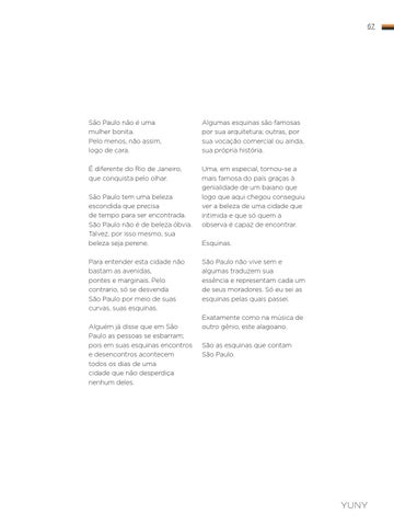 São Paulo tem uma beleza escondida que precisa de tempo para ser encontrada. São Paulo não é de beleza óbvia. Talvez, por isso mesmo, sua beleza seja perene. Para entender esta cidade não bastam as avenidas, pontes e marginais. Pelo contrario, só se desvenda São Paulo por meio de suas curvas, suas esquinas. Alguém já disse que em São Paulo as pessoas se esbarram; pois em suas esquinas encontros e desencontros acontecem todos os dias de uma cidade que não desperdiça nenhum deles.