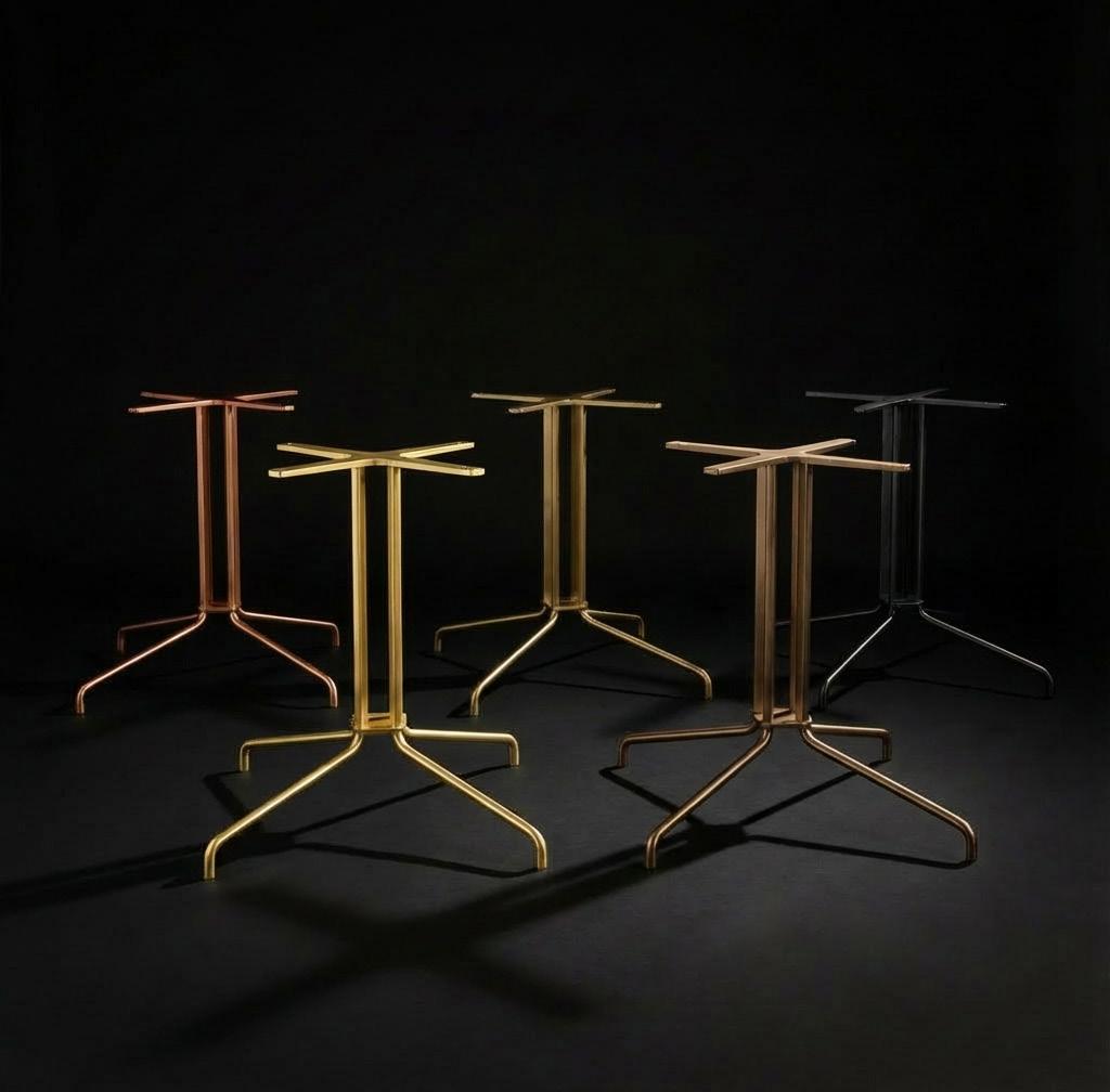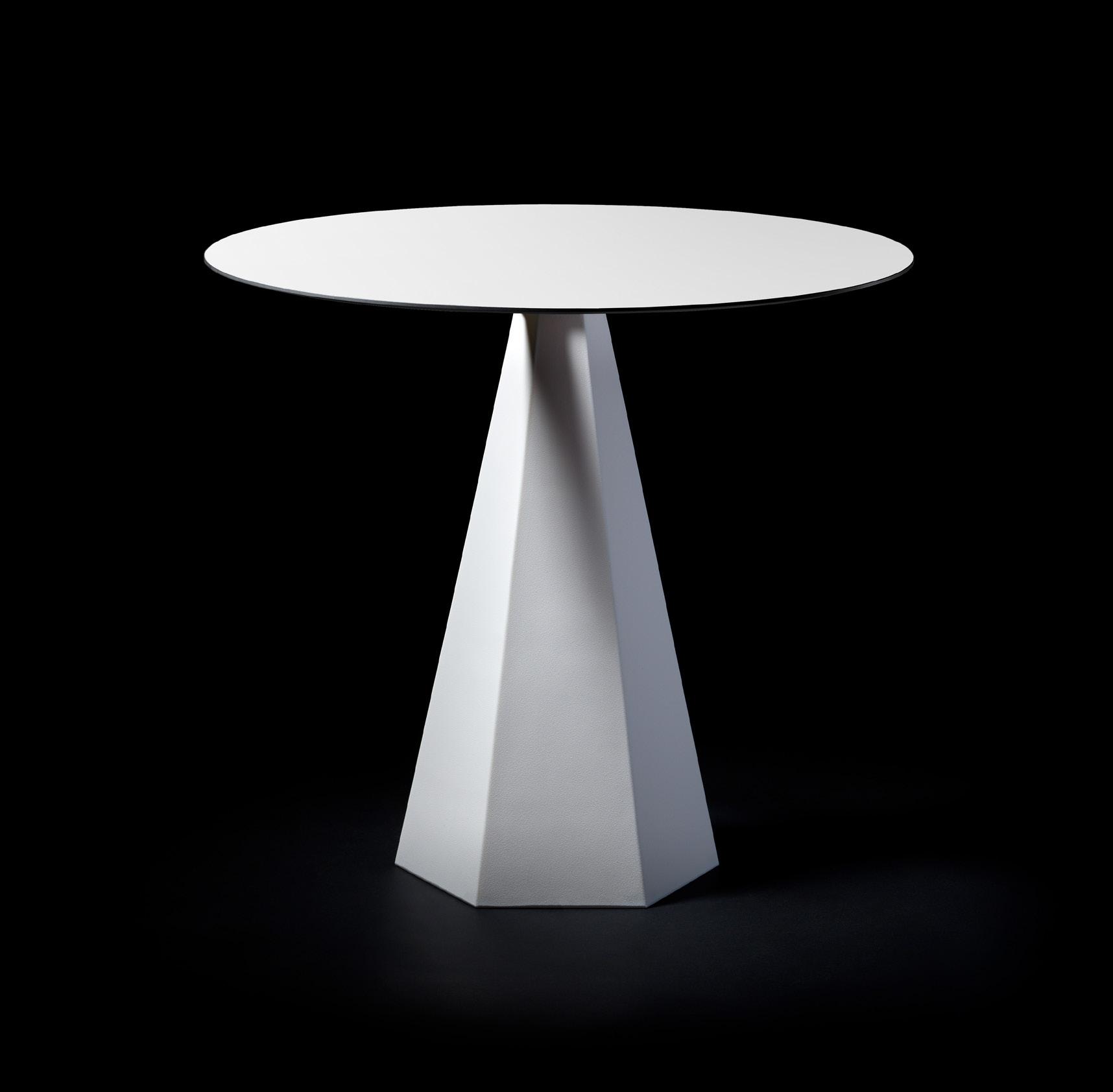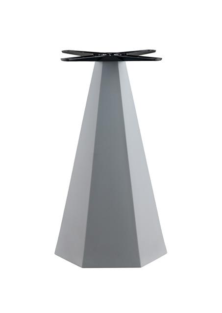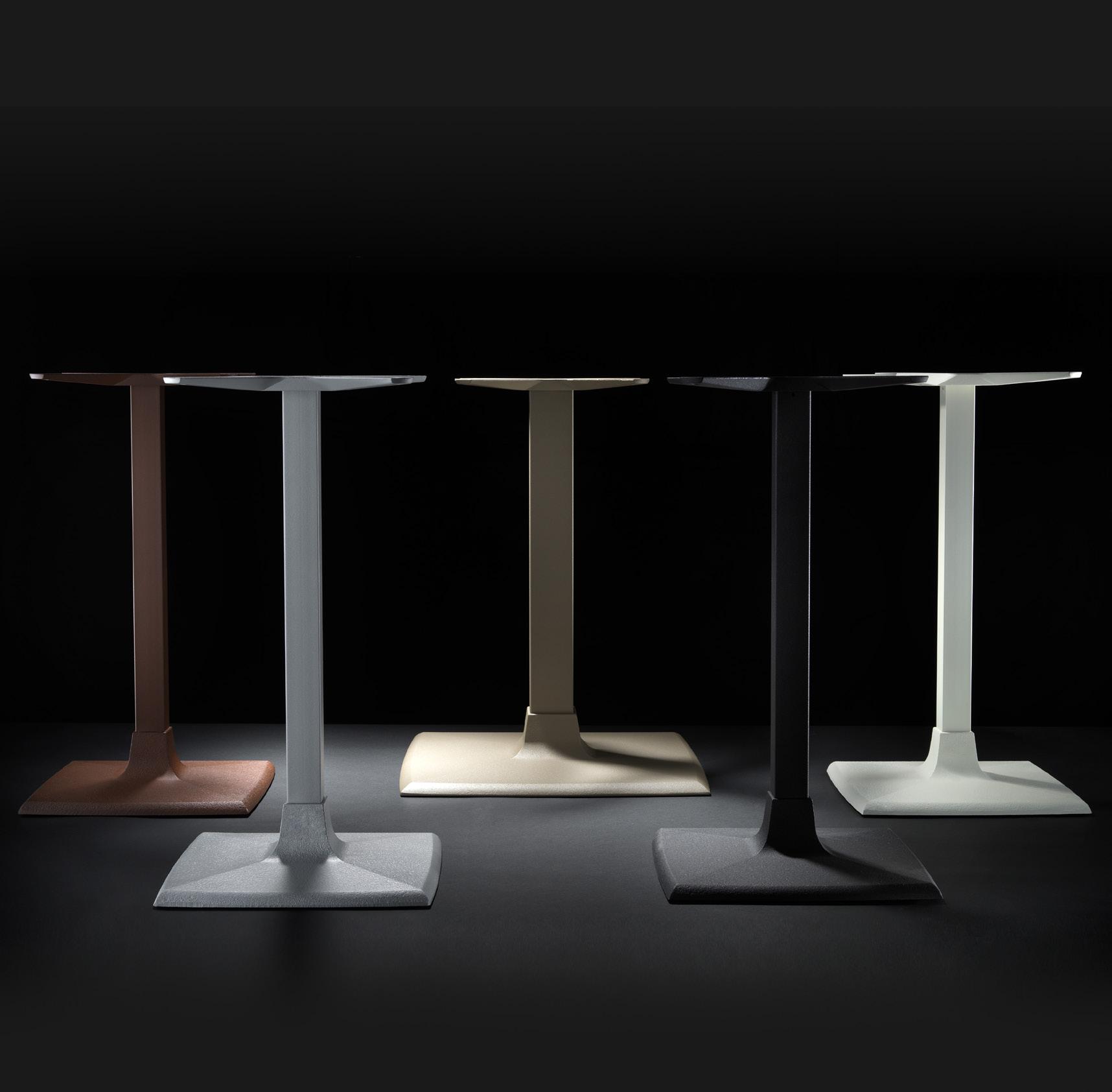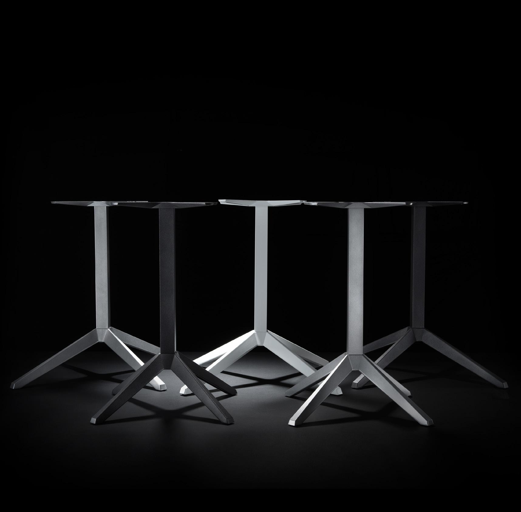 Prisma is a collection of 100% recyclable aluminum bases inspired by prism geometries. Available in two sizes and three standard heights, ideal for outdoor use and compatible with various tabletops