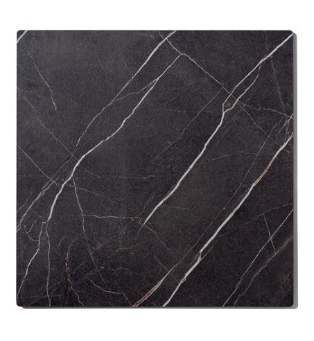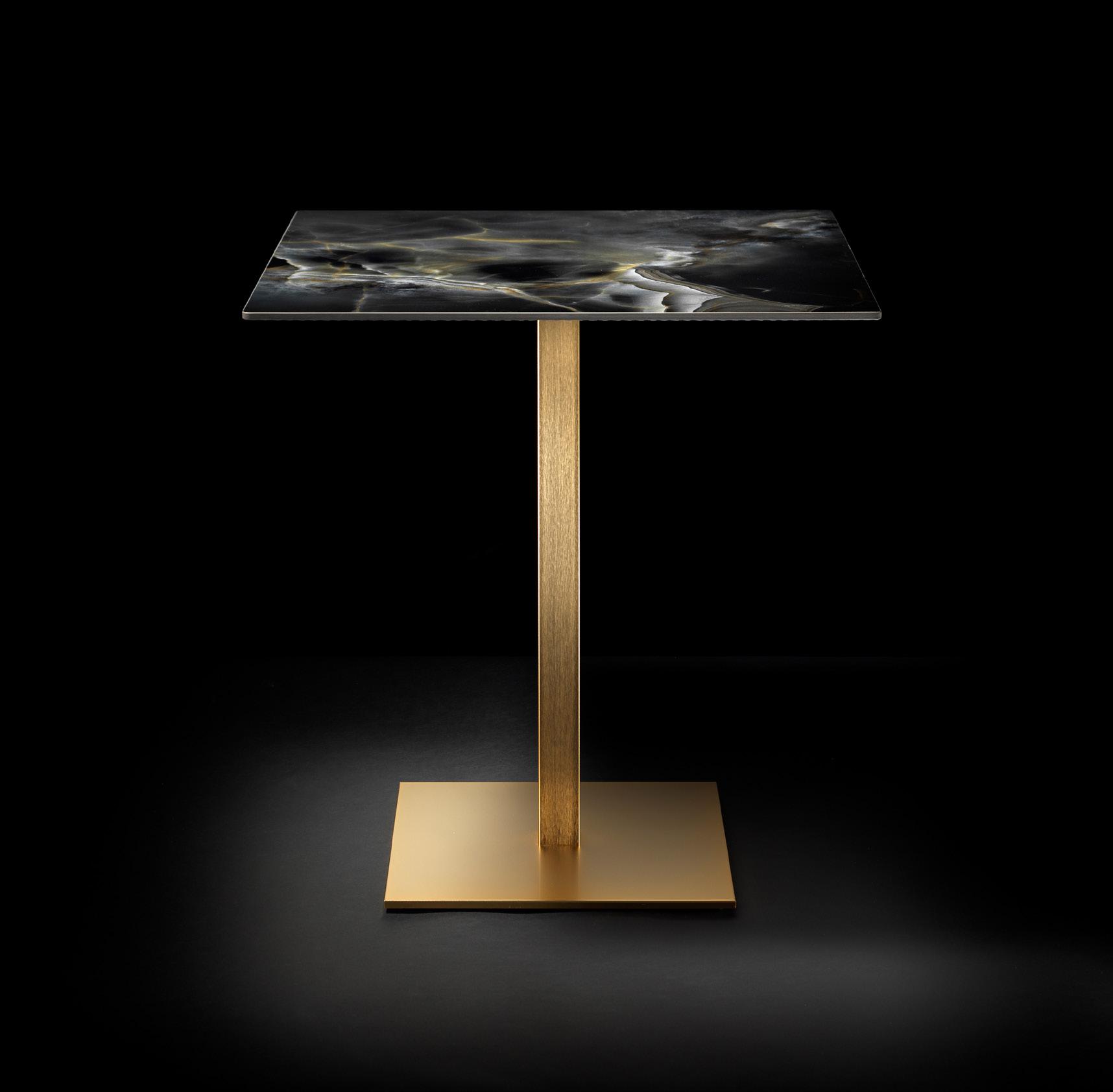 Il tavolo Vision abbina la base Vision, qui in finitura oro nero lucido, al piano quadrato in HPL Marmo Africa, nero con eleganti venature bianche. Il piano HPL garantisce resistenza, facilità di pulizia e versatilità.
