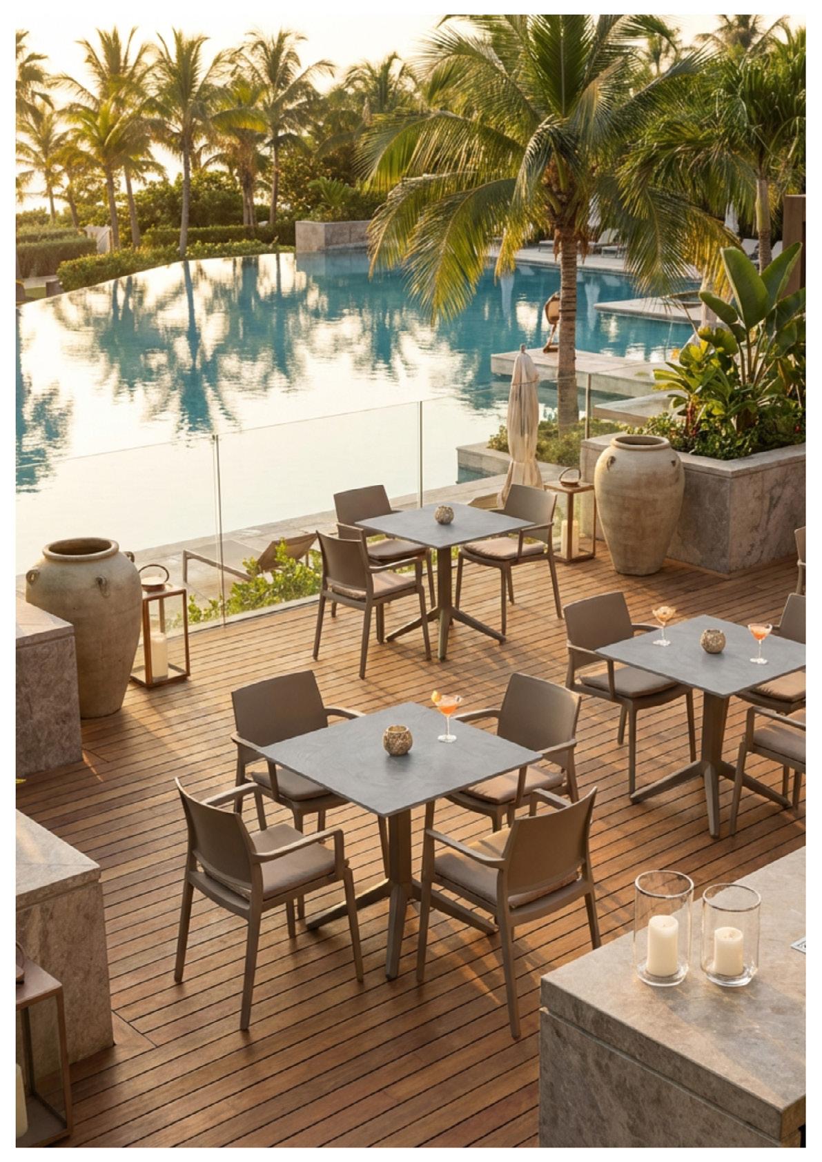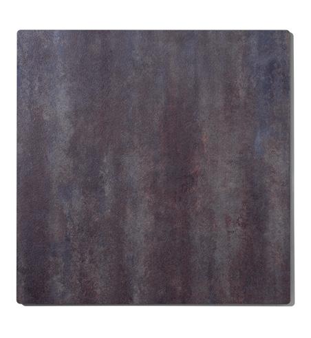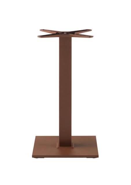 The Petra table pairs the Petra base in rust finish with a square HPL Corteneffect top. A practical surface suitable for both indoor and outdoor contract settings.