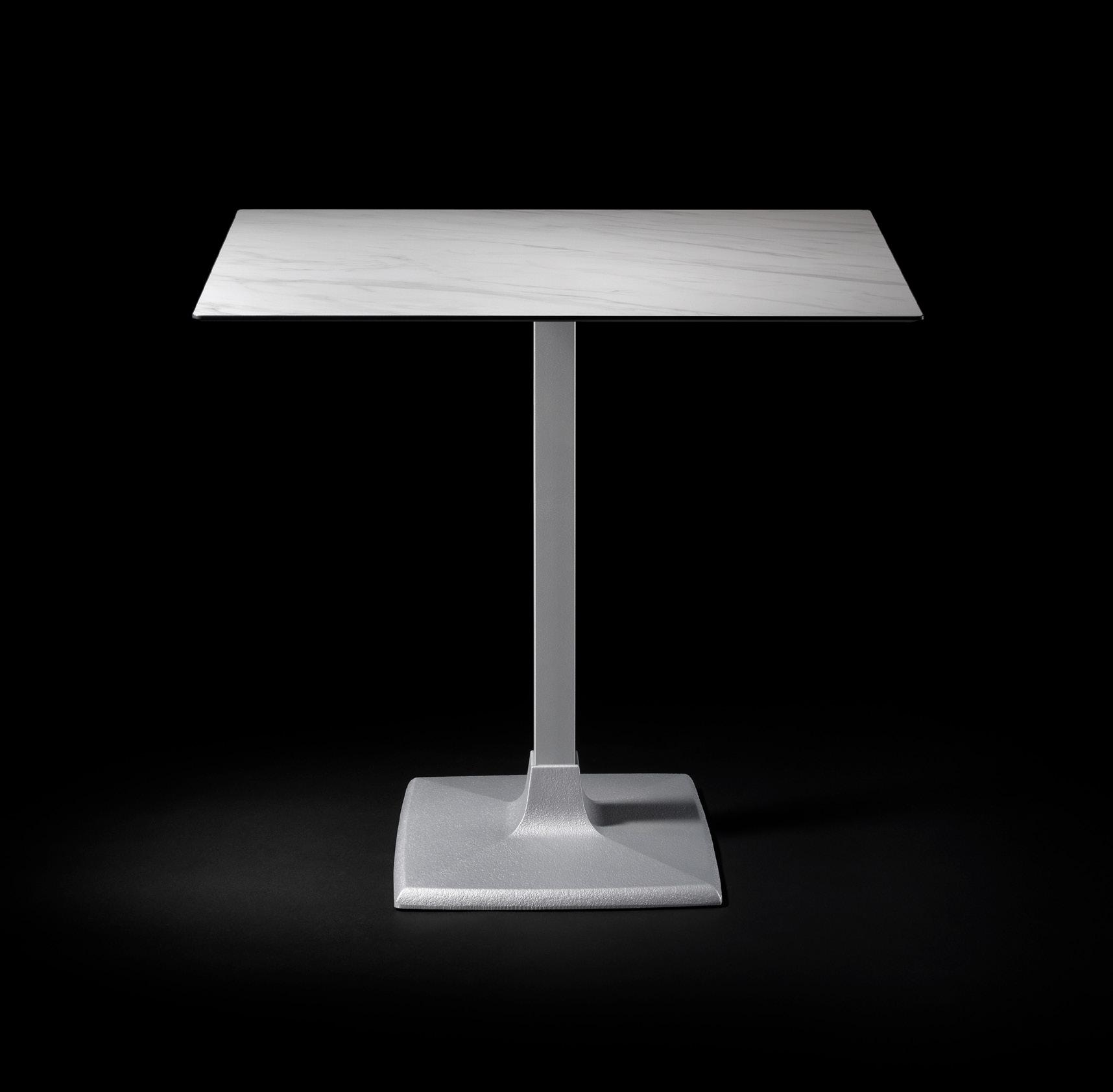 Il tavolo Capitol, composto dalla base Capitol, proposto in finitura argento lucido metalliz zato e piano quadrato in HPL Marmo Carrara. Un abbinamento che valorizza ambienti eleganti, con un piano resistente.