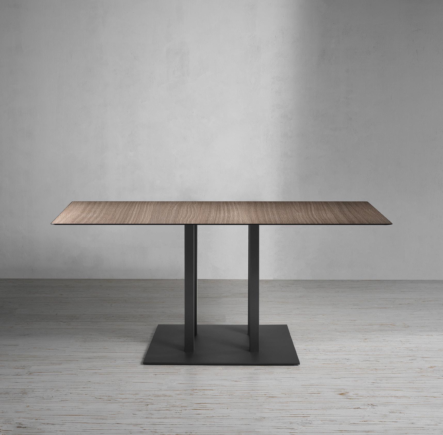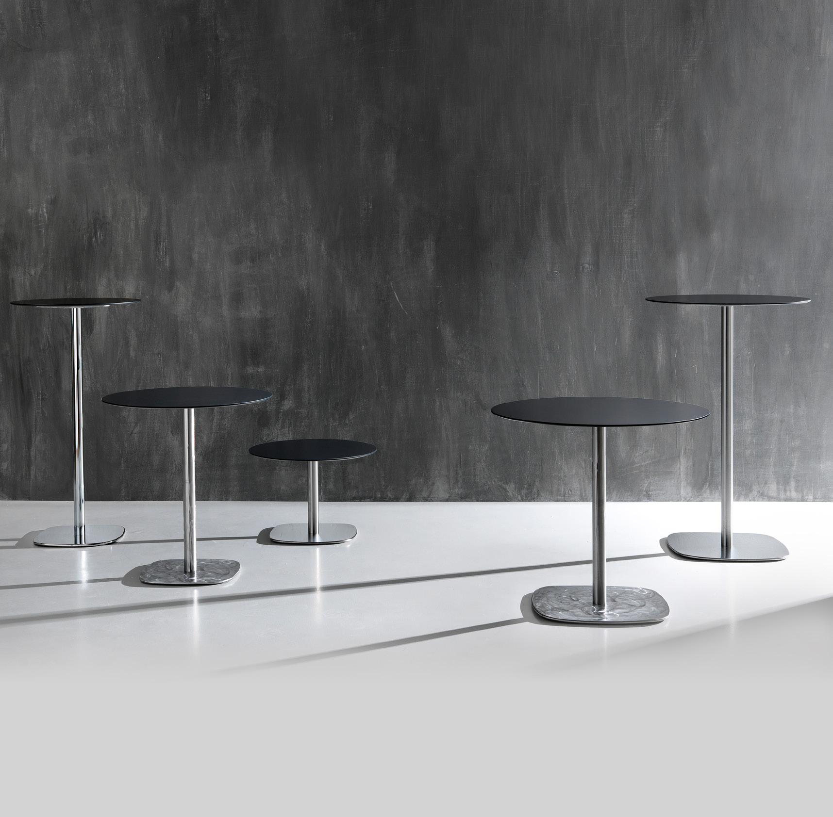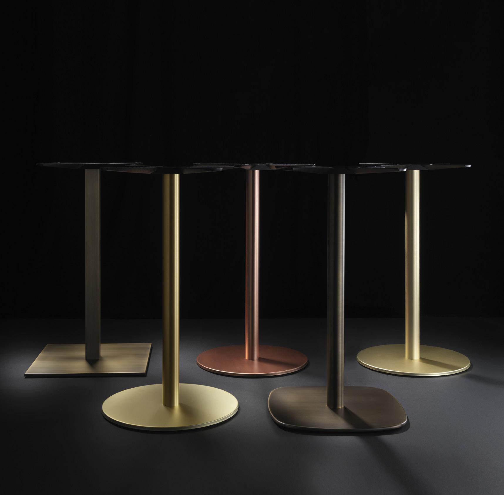 The Slim collection, made of steel, stands out for its slender columns and flat bases, giving tables a sleek, minimal, and elegant appearance. Available in various shapes, sizes, and finishes.