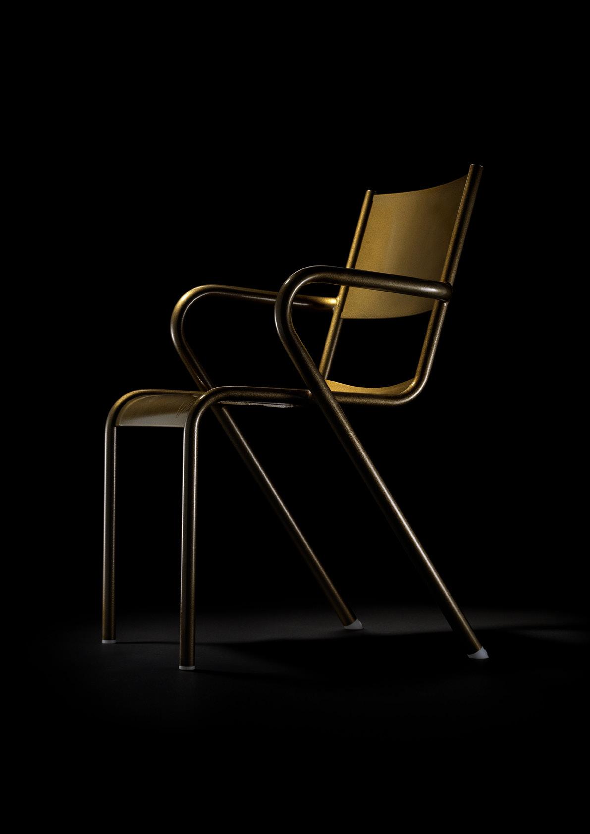 The V12 chair is made entirely of aluminum and features a clean, dynamic design. Ideal for outdoor use, it is lightweight, easy to clean, and stackable up to four pieces—a durable and contemporary chair.