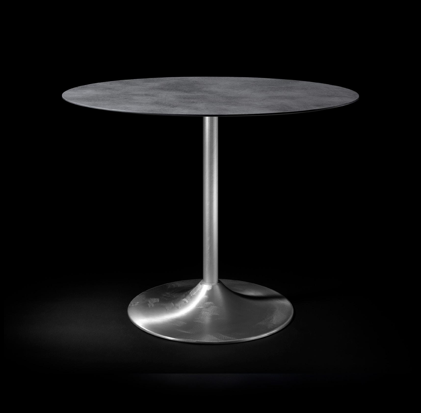 Il tavolo Matrix è composto dalla base 55, qui in alluminio grezzo, con un piano rotondo in HPL effetto cemento. Una soluzione pratica e contemporanea, con piano di alta qualità adatto ad uso intensivo.