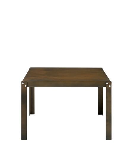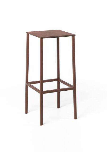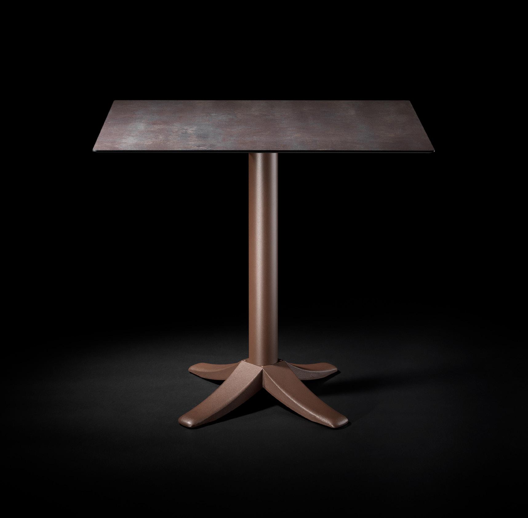 Il tavolo Petra accosta la base Petra, qui in finitura ruggine, a un piano quadrato in HPL effetto Corten. Una superficie pratica e adatta al mondo contract, in situazioni sia indoor che outdoor.
