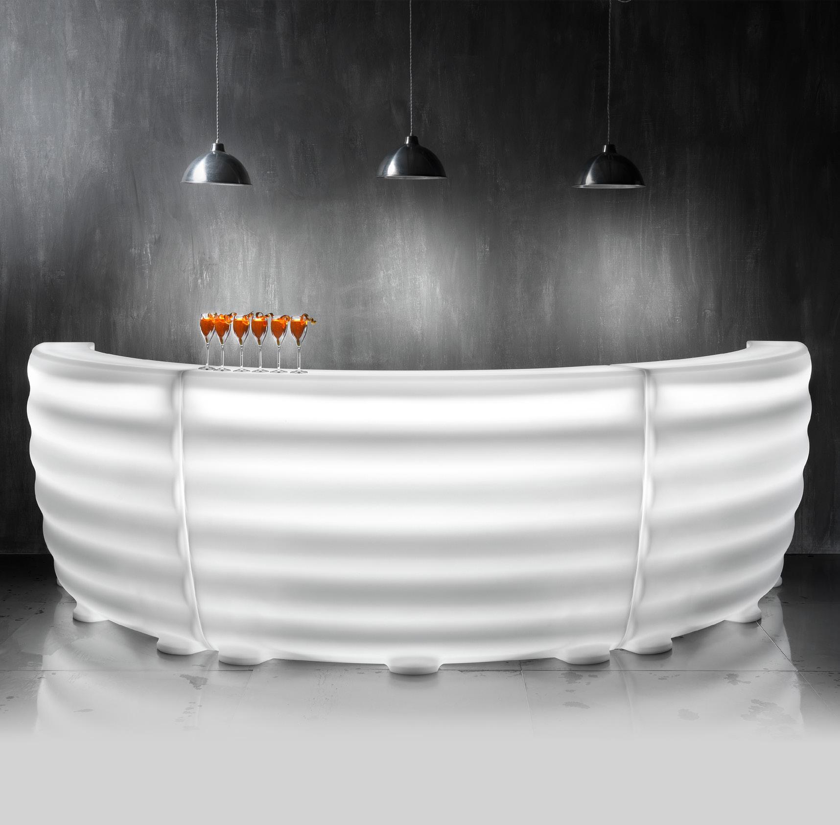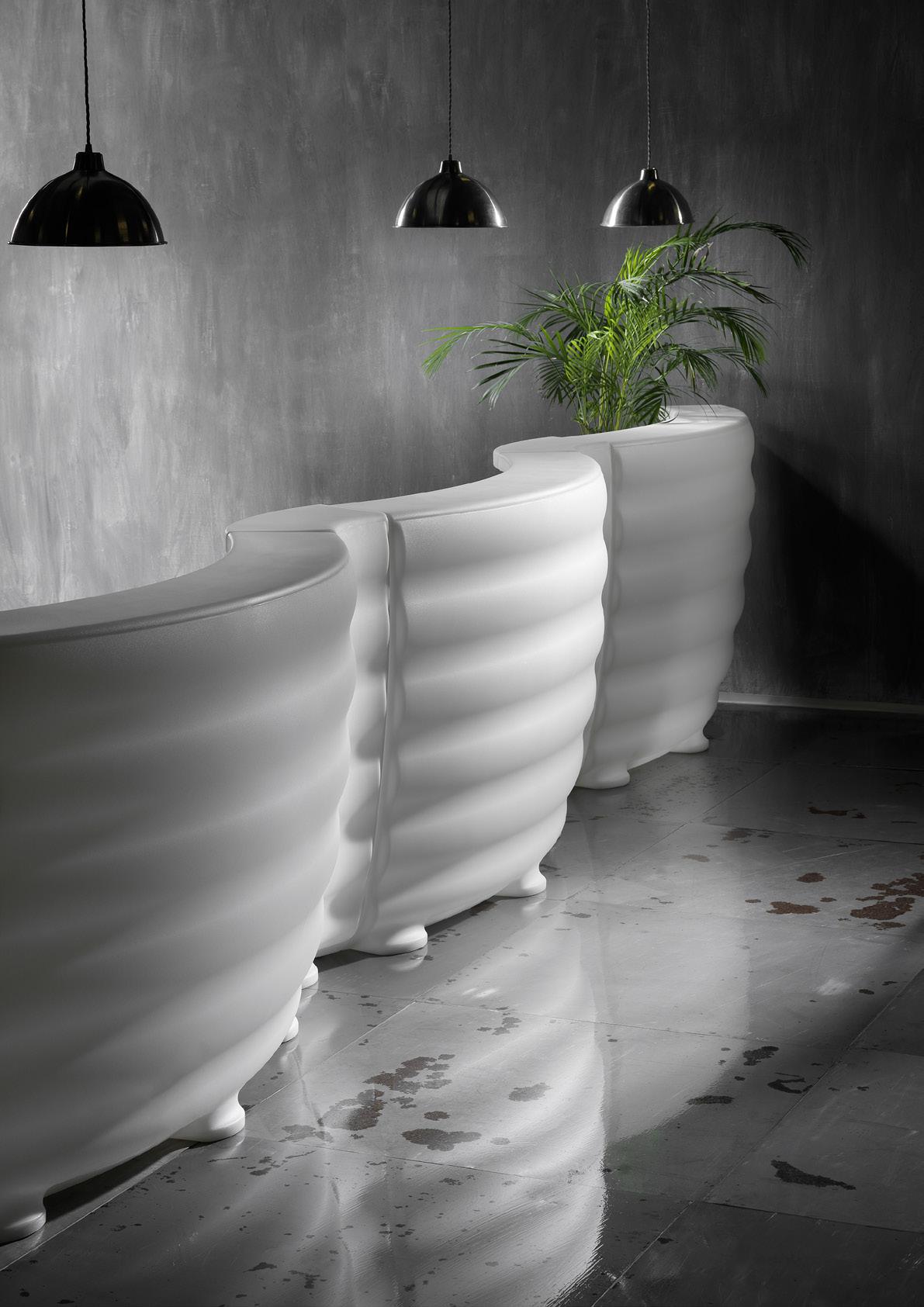 Androyd è un bancone bar modulare realizzato interamente in polietilene, adatto all’uso indoor e outdoor. Il design scultoreo crea suggestivi giochi di luce e consente molteplici configurazioni compositive.