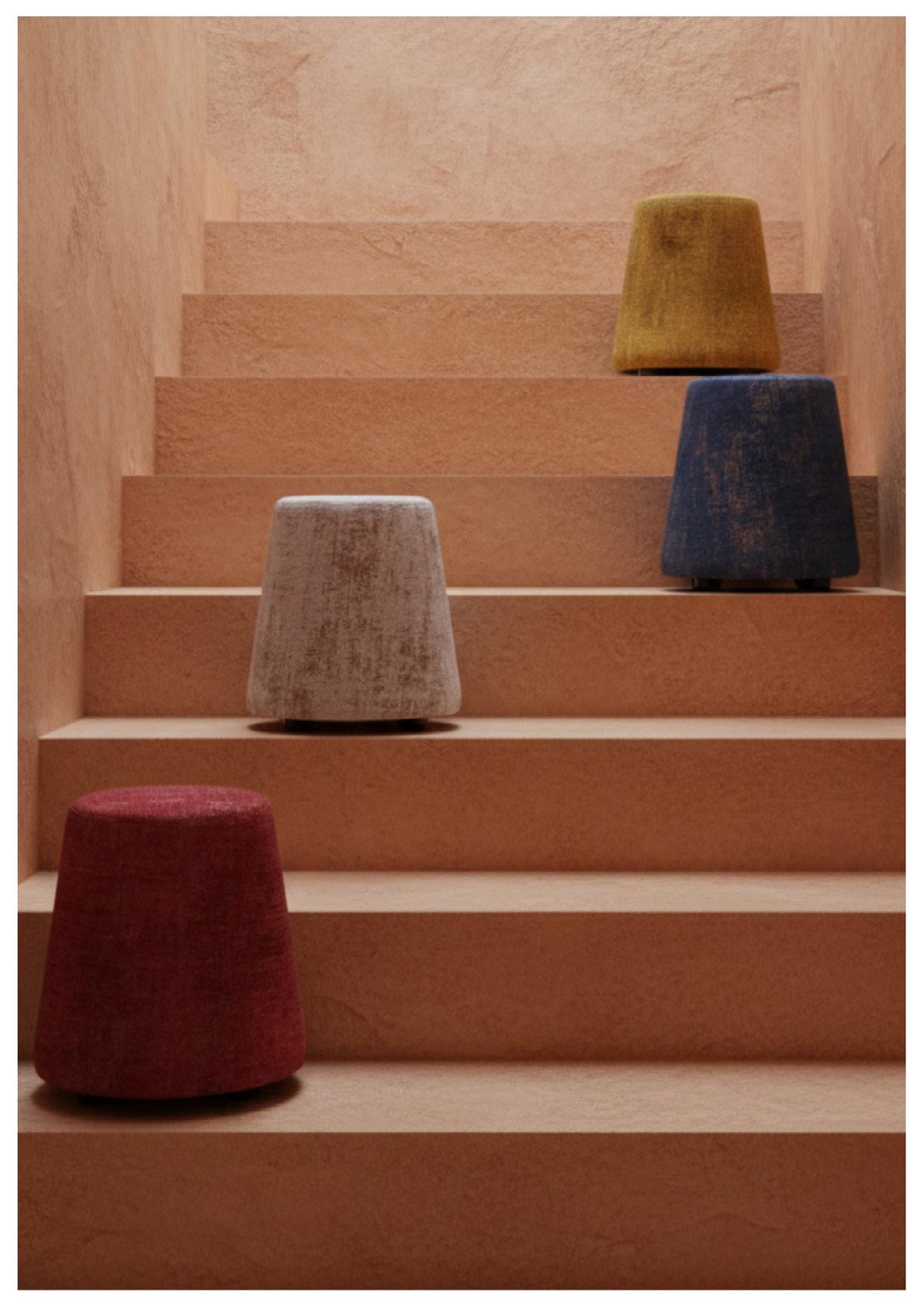 The Olli pouf is the smaller pouf in the Olli line, featuring a conical shape and padded wooden structure. Upholstered in fabric, velvet, or faux leather, it adds warmth and hospitality to any space.
