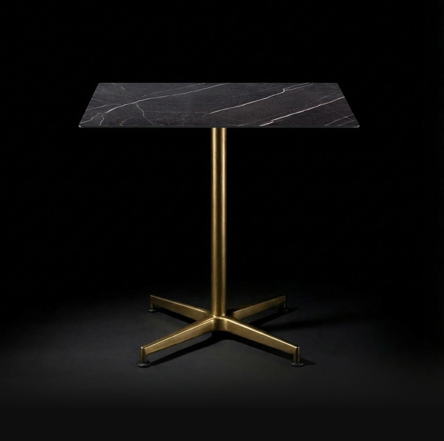 The Vision table pairs the Vision base in glossy black-gold finish with a square HPL Marmo Africa top, black with elegant white veining. The HPL top ensures durability, easy maintenance, and versatility.